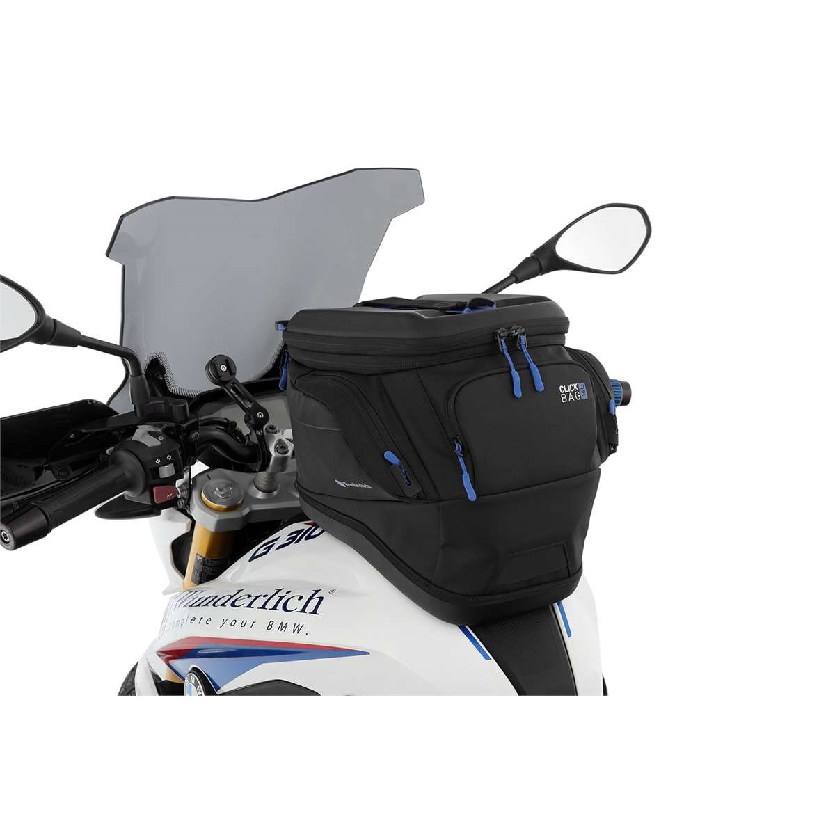 Der modellspezifische, sogenannte Tankring bildet die solide Basis zur sicheren, mechanischen Arretierung der CLICK BAG Tankrucksäcke. Zum Befestigen wird der CLICK BAG von oben in die beiden Führungen des Tankrings eingesetzt, bis das Schloss automatisch verriegelt. Mit einem Riemen am Tankrucksack lässt sich die Arretierung mit einem Zug lösen. So kann der Tankrucksack im Handumdrehen - zum Beispiel zum Tanken – abgenommen werden.