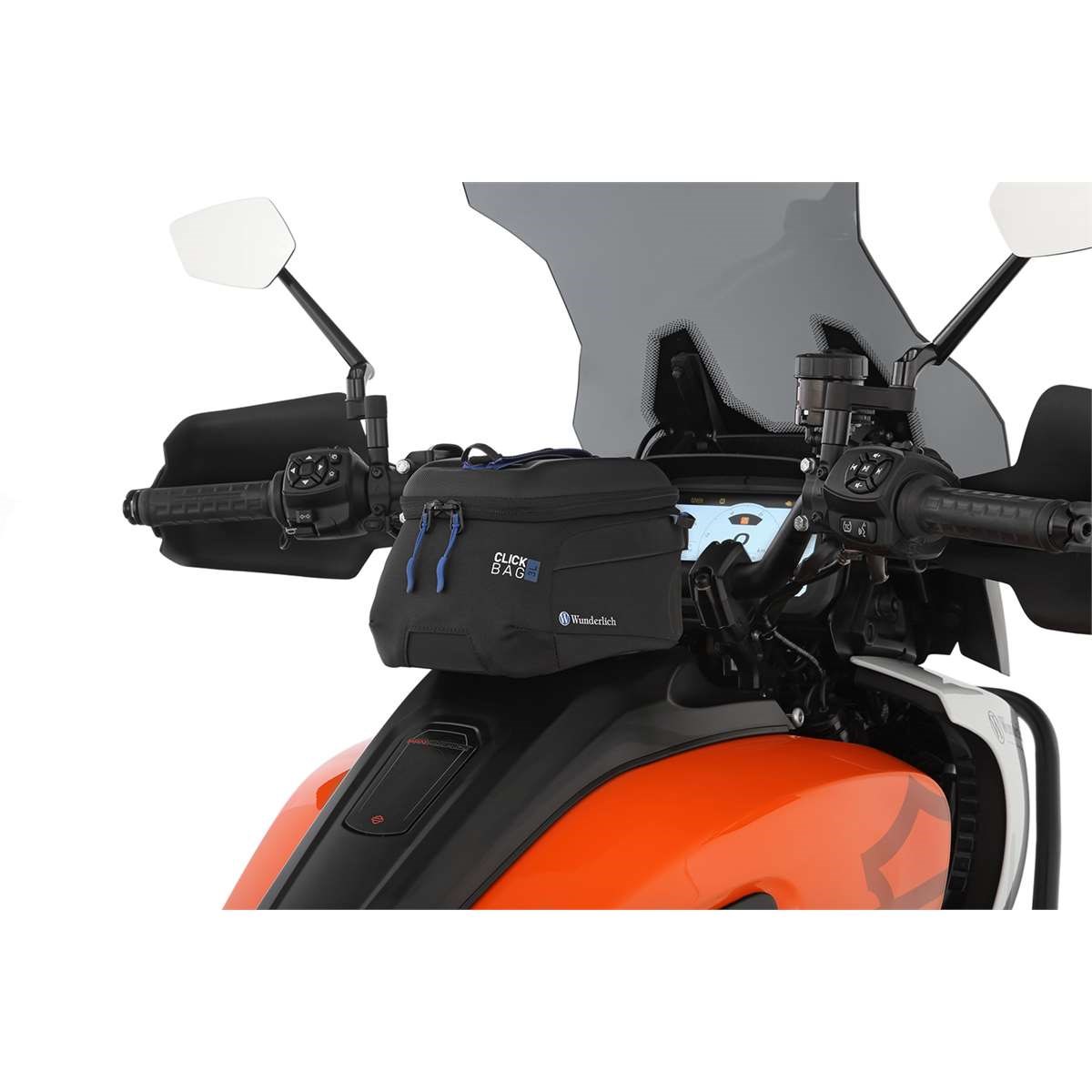 Das Handling ist ausgesprochen komfortabel: Beim Befestigen wird der CLICK BAG von oben in den Tankring eingesetzt, bis das Schloss automatisch verriegelt. Mit einem Riemen lässt sich die Arretierung mit einem Zug lösen. So lässt sich der Tankrucksack im Handumdrehen zum Tanken abnehmen. Die robuste Verschlussmechanik kann in Längsrichtung nach vorne oder hinten verschoben werden. So kann die Position des Tankrucksack auf dem Tank in einem 20 mm-Raster in drei Position den individuellen Bedürfnissen und Gegebenheiten angepasst werden, die sich aus der Tankform oder dem Lenkeinschlag ergeben.