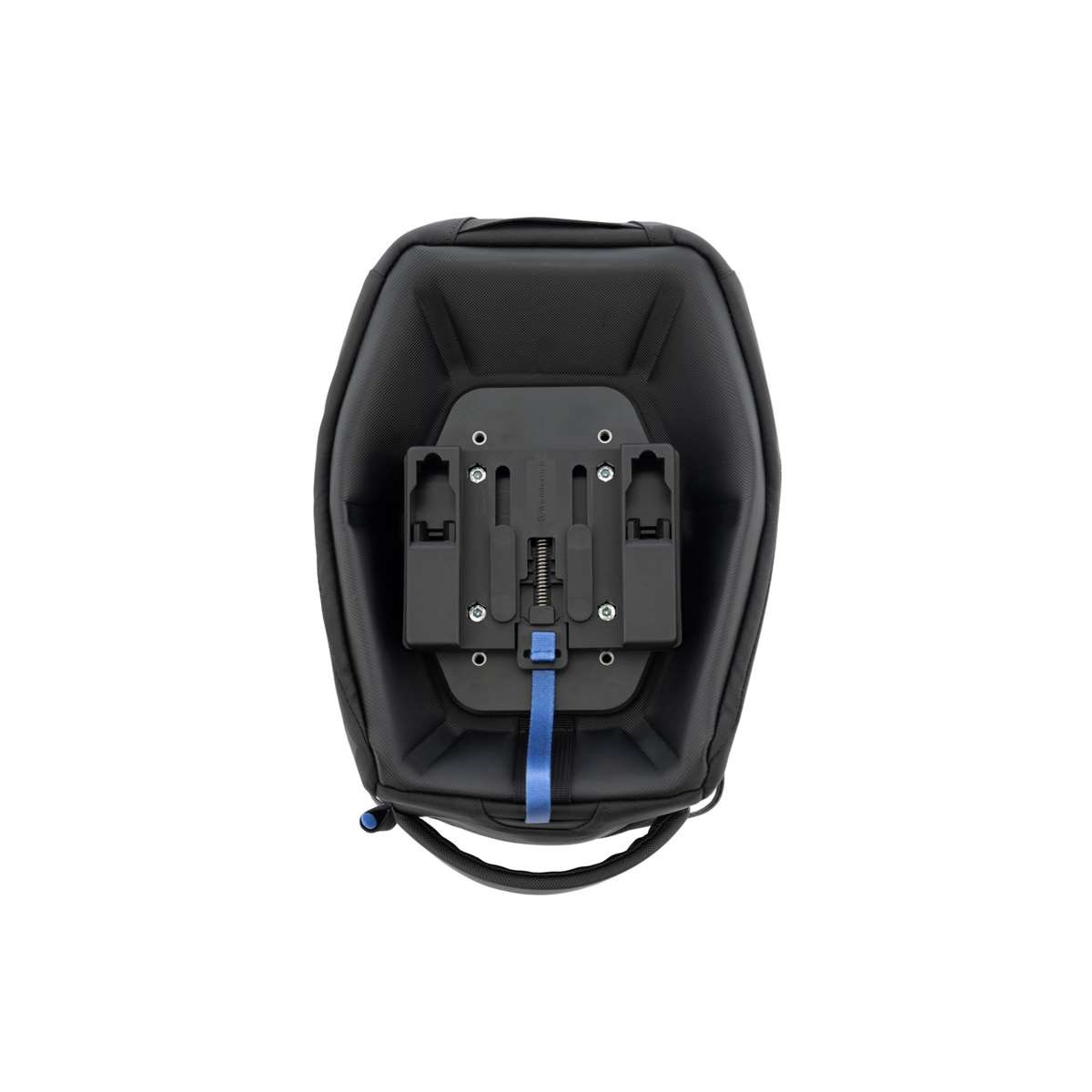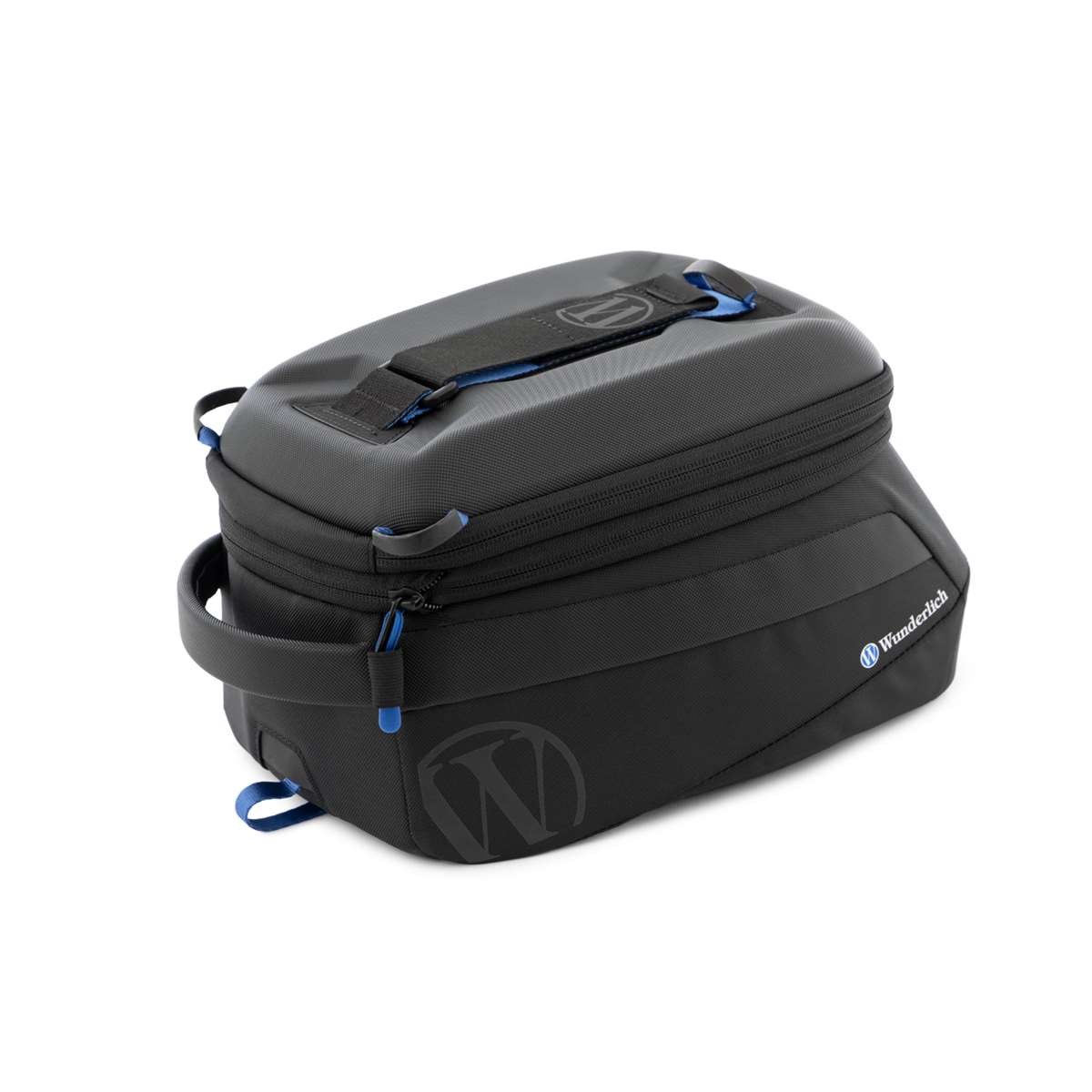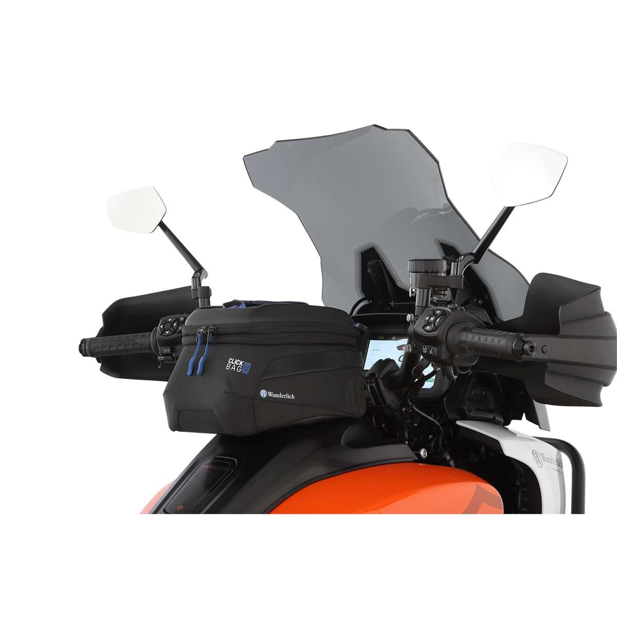 Das Handling ist ausgesprochen komfortabel: Beim Befestigen wird der CLICK BAG von oben in den Tankring eingesetzt, bis das Schloss automatisch verriegelt. Mit einem Riemen lässt sich die Arretierung mit einem Zug lösen. So lässt sich der Tankrucksack im Handumdrehen zum Tanken abnehmen. Die robuste Verschlussmechanik kann in Längsrichtung nach vorne oder hinten verschoben werden. So kann die Position des Tankrucksack auf dem Tank in einem 20 mm-Raster in drei Position den individuellen Bedürfnissen und Gegebenheiten angepasst werden, die sich aus der Tankform oder dem Lenkeinschlag ergeben.