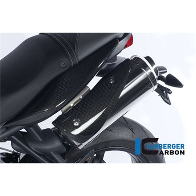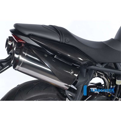 Das Auspuffabdeckung für die Ducati Diavel V4 schützt den Endtopf und verleiht dem Serienauspuff ein völlig neues sportliches Erscheinungsbild. Das Carbonteil deckt den Endtopf über die volle Höhe ab und macht auch bei stehendem Motorrad auf dem Seitenständer eine gute Figur! Die finale Klarlackschicht kommt in der matten Version und ist identisch zu dem verwendeten Klarlack der Ducati Performance Teile.
