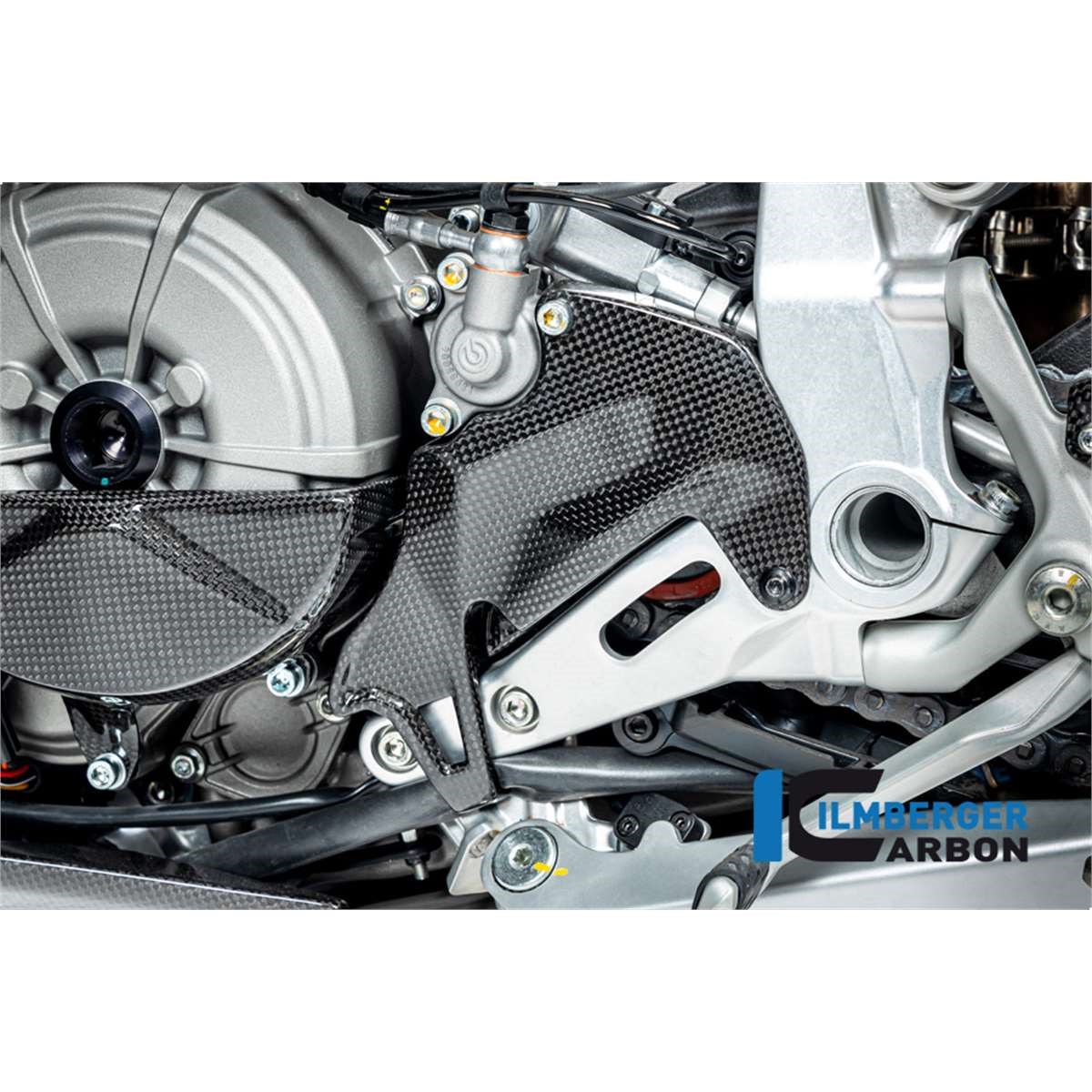 Die Ritzelabdeckung ist eines der am meist unterschätzten Bauteile am ganzen Motorrad. Zentral am Motorrad verbaut umgibt sie das Kettenritzel und leistet mehr als es auf den ersten Blick scheinen mag. Es schützt den Motor und viele weitere Komponenten vor herumfliegenden Kettenfett bei der Fahrt. Dieses ist als Schmutz besonders hartnäckig und lässt sich von der weichen Oberfläche des Originalteils nur schwer wieder entfernen. Eine harte Oberfläche, wie sie bei hochwertigem Carbon vorkommt eignet sich hier besser.