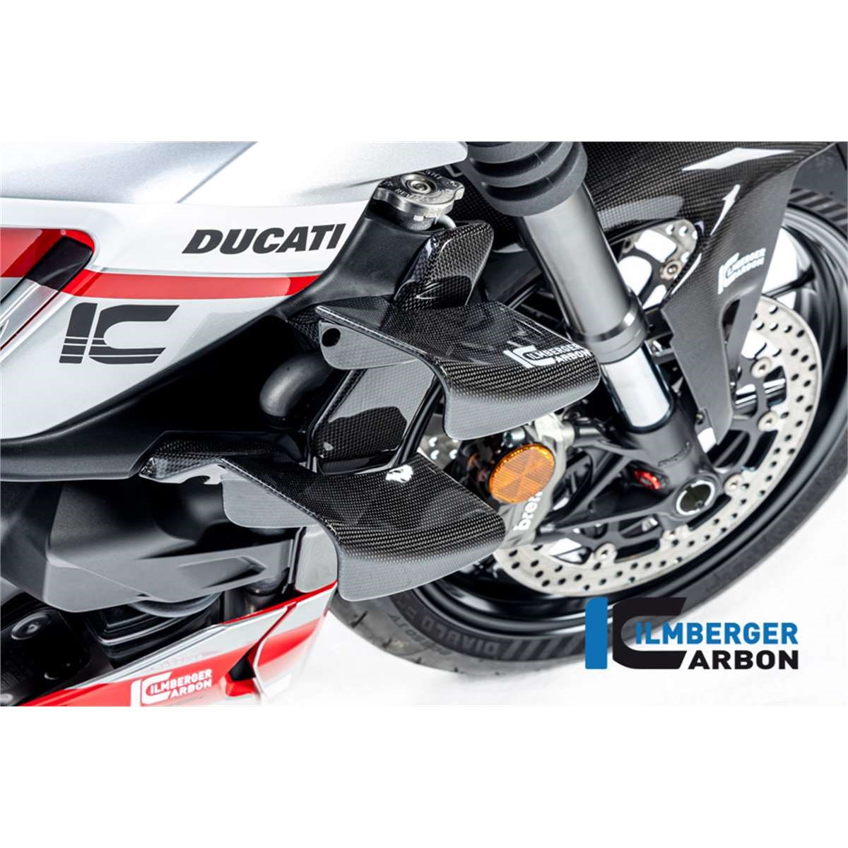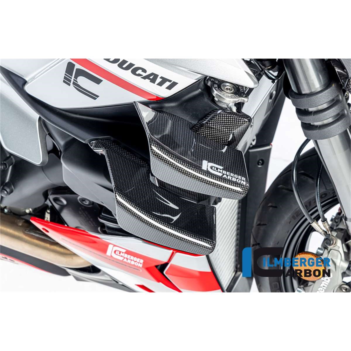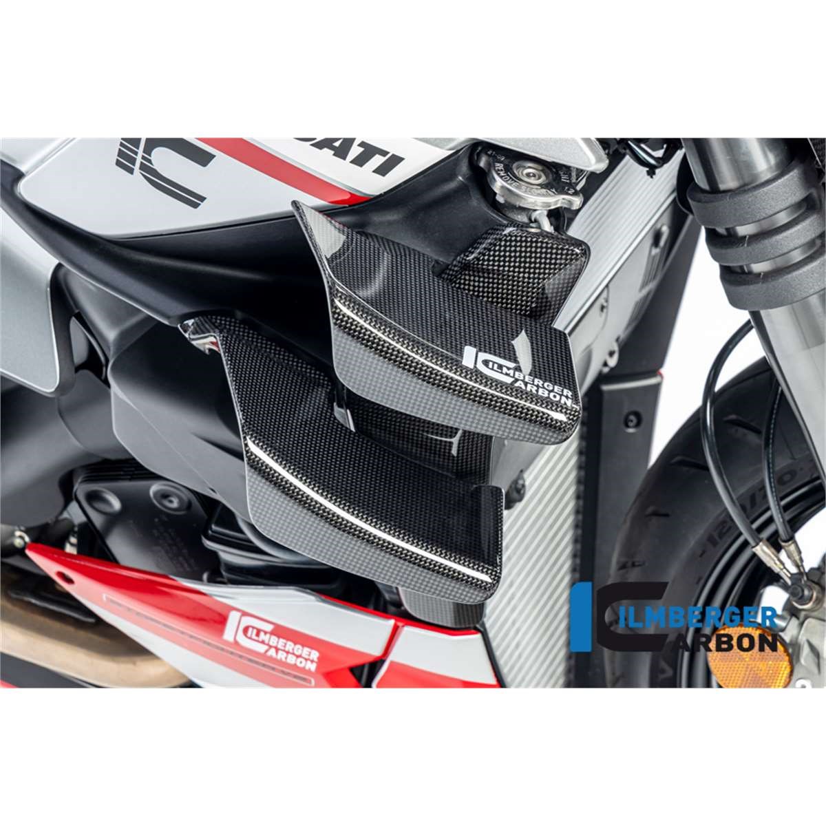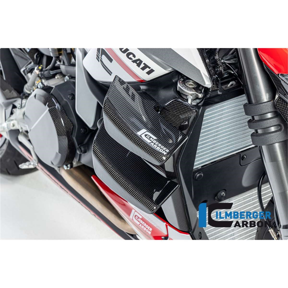 Die Wasserkühlerabdeckung verstärkt die Aggressivität der Streetfighter V2 zusätzlich. Das rechte Blechteil entfällt und wird durch das glänzende Carbonteil ersetzt. Zusätzlich wird das Gewicht spürbar reduziert.