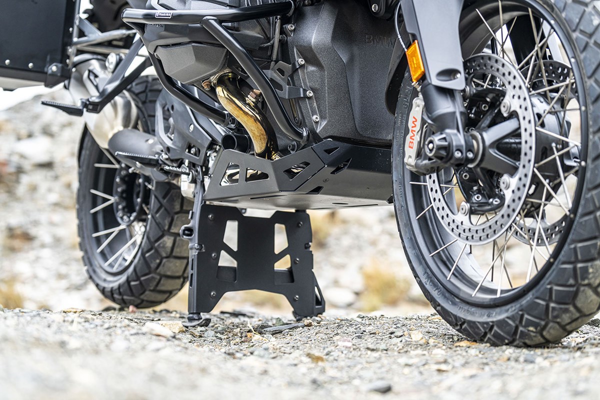 Die Hauptständerschutzplatte ist die logische Ergänzung zum Motorschutz ULTIMATE. Die Unterflur-Schutzwirkung wird vom Motorschutz über die Hauptständerschutzplatte nach hinten ausgedehnt. So reduzieren wir bei Geländefahrten die Gefahr von Schäden am Hauptständer, dem Sammler (Katalysator) und der Schwingenbasis. Außerdem kann die Maschine im Falle des Aufsetzers über die komplette Schutzfläche gleiten, bis das Hinterrad wieder Bodenkontakt bekommt und Grip aufnimmt.