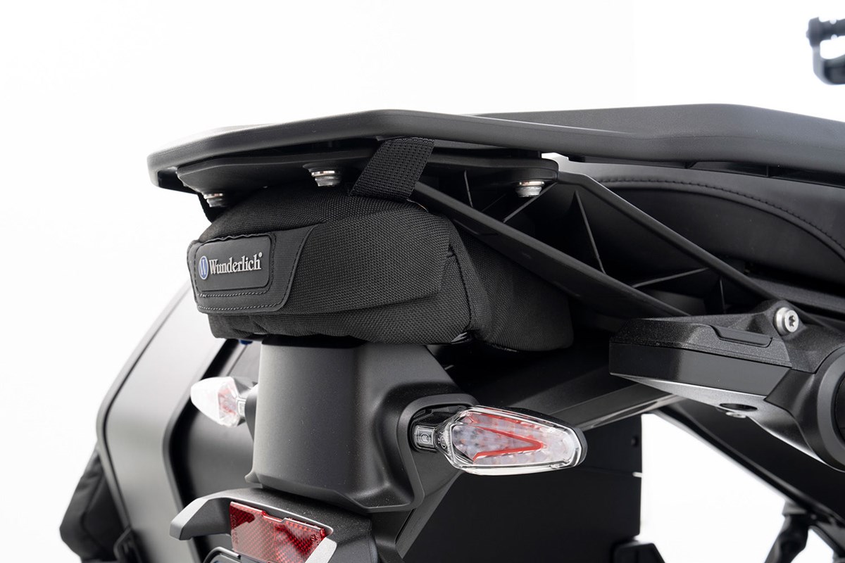 Perfekt maßgeschneidert fügt sich diese hochwertige Gepäcktasche griffgünstig gelegen in der Lücke unterhalb des Gepäckträgers ein und nutzt so den freien Raum optimal aus. Die aus nachhaltigem CORDURA® TrueLock™ gefertigte Tasche verfügt über ein Fach, das mit den griffigem Zipper des wasserabweisenden Reißverschlusses auch mit Handschuhen geöffnet und geschlossen werden kann. Sie eignet sich besonders für Kleinigkeiten, die schnell greifbar sein sollen. So finden beispielsweise das Erste-Hilfe-Set, Werkzeug etc. problemlos Platz. Die einfache Befestigung erfolgt durch die Befestigungslasche auf der Oberseite der Tasche. Durch die rutschfeste Unterseite sitzt die Tasche fest am Fahrzeug. Mit Wunderlich Markenlogo.
