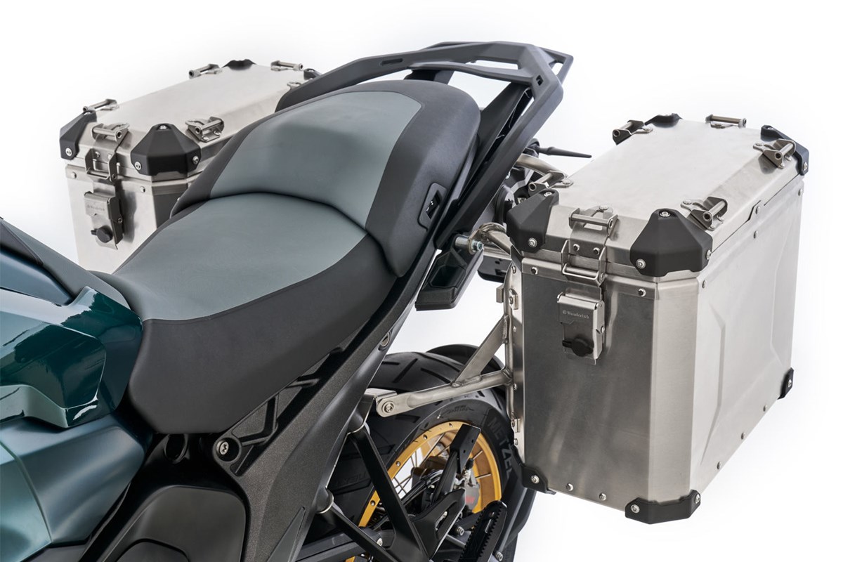 Dieser modellspezifische Kofferträger dient zur Aufnahme unserer Systemkoffer aus der Serie EXTREME (regular und slimline). Die Montage erfolgt jeweils an vier bereits vorhandenen Anschraubpunkten pro Fahrzeugseite. Zusätzlich werden die beiden Kofferträger mit einer Verbindungsstrebe miteinander verbunden. So entsteht eine leichte, gleichzeitig ausgesprochen steife und stabile Struktur, die pistentauglich ist.