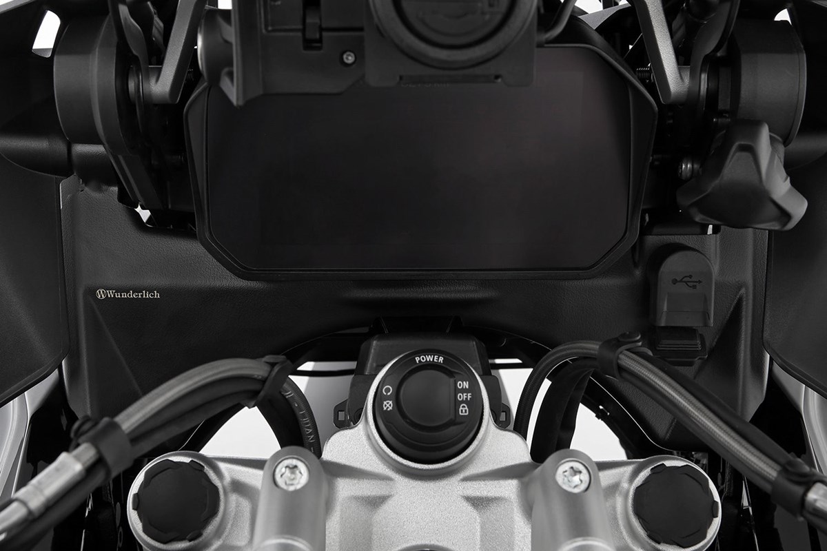 Sie wünschen sich endlich ein aufgeräumtes hochwertiges Cockpit für Ihre GS? Wir empfehlen diese Wunderlich Cockpitblende. Zwischen dem Kombiinstrument des Cockpits und der Gabelbrücke, dort wo die Hydraulikleitungen von Vorderradbremse und Kupplung, sowie die elektrischen Leitungen der Armaturen verlegt sind, tut sich eine Art optischer Abgrund auf: Man blickt auf die Rückseite des Scheinwerfers, unlackierte Verkleidungsinnenseiten, den Kotflügel, Teile des Telelevers sowie den Wust unterschiedlicher Leitungen.