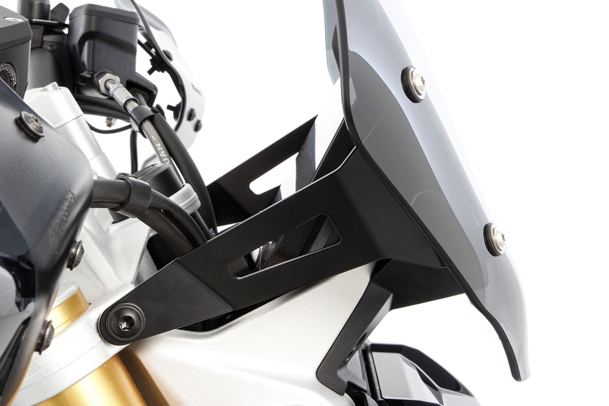 Die biegesteife Scheibenverstärkung wird zwischen der originalen Scheibenhalterung und der Scheibe befestigt und zusätzlich an der Scheinwerferhalterung seitlich verschraubt. So wird die originale Halterung verstärkt und gestützt um hohe Winddrücke sowie Vibrationen der Scheibe und die Gefahr daraus resultierender Vibrationsrisse zu minimieren.