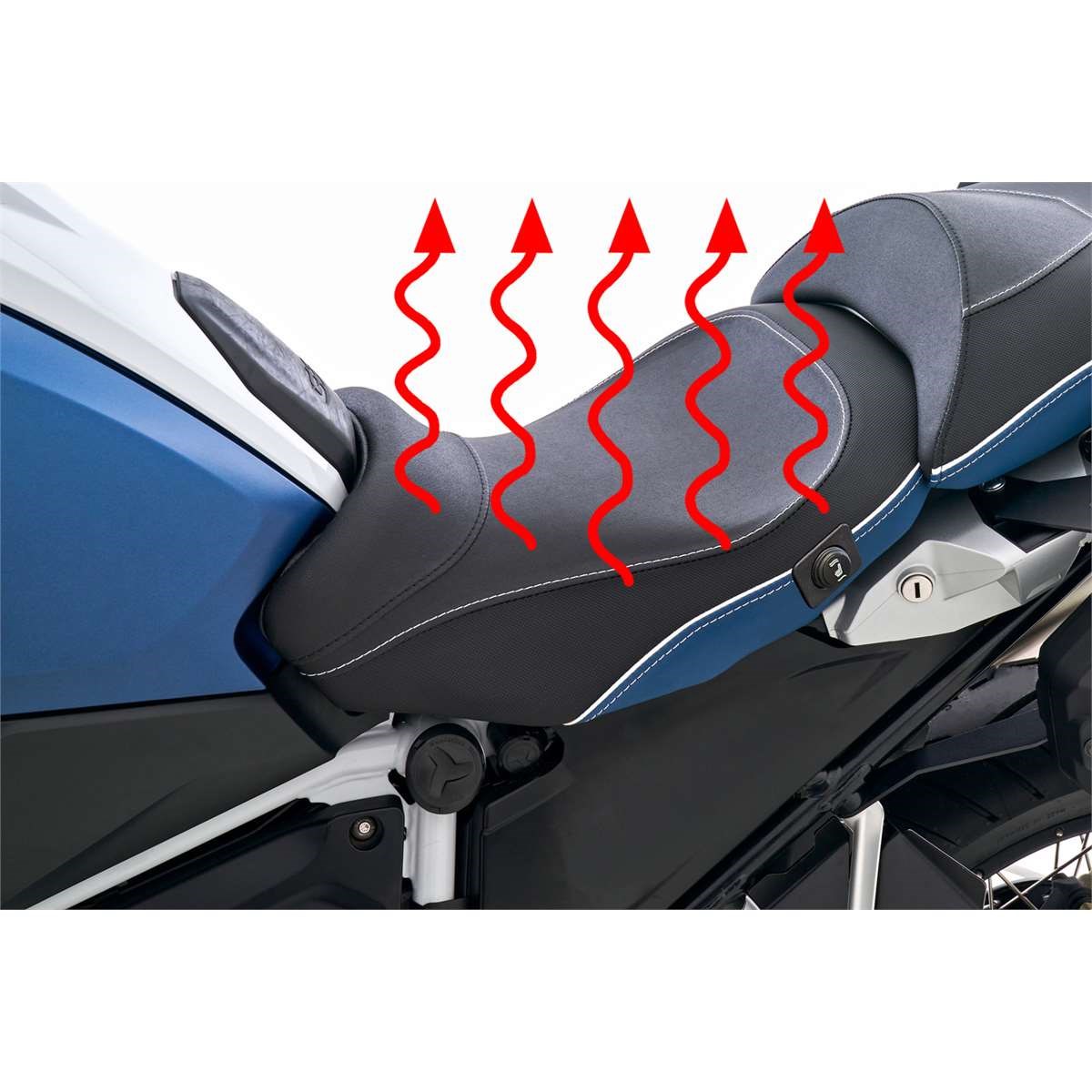 • Die Zweistufensteurung der Heizleistung erfolgt komfortabel und sicher mit einem Schalter an der linken Sitzflanke – so bleibt die Gashand am Lenker