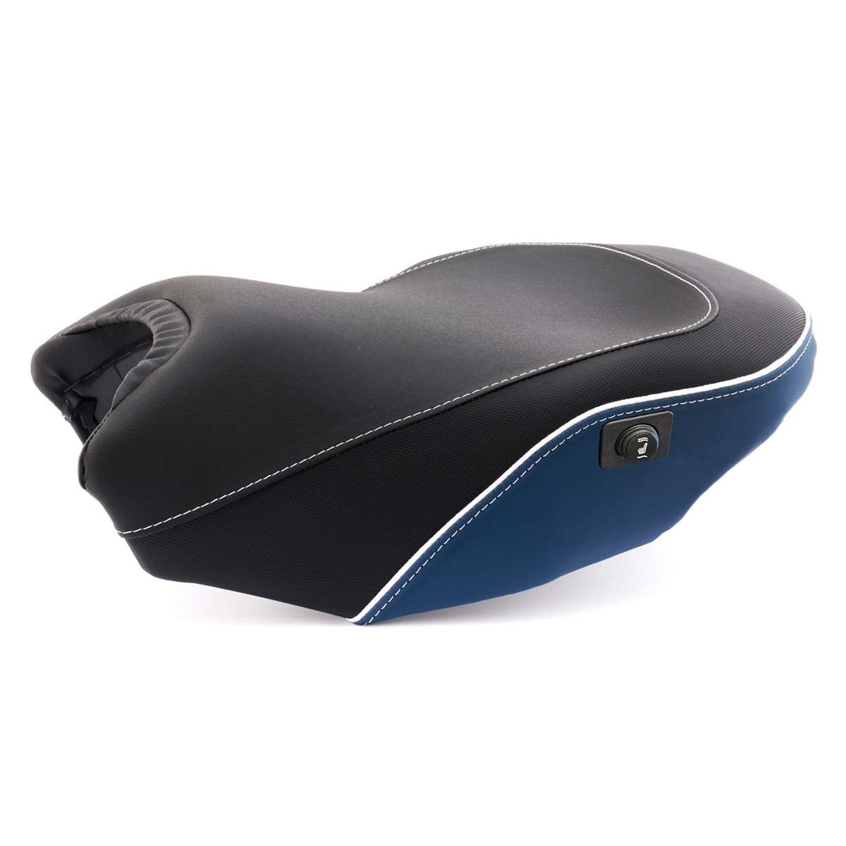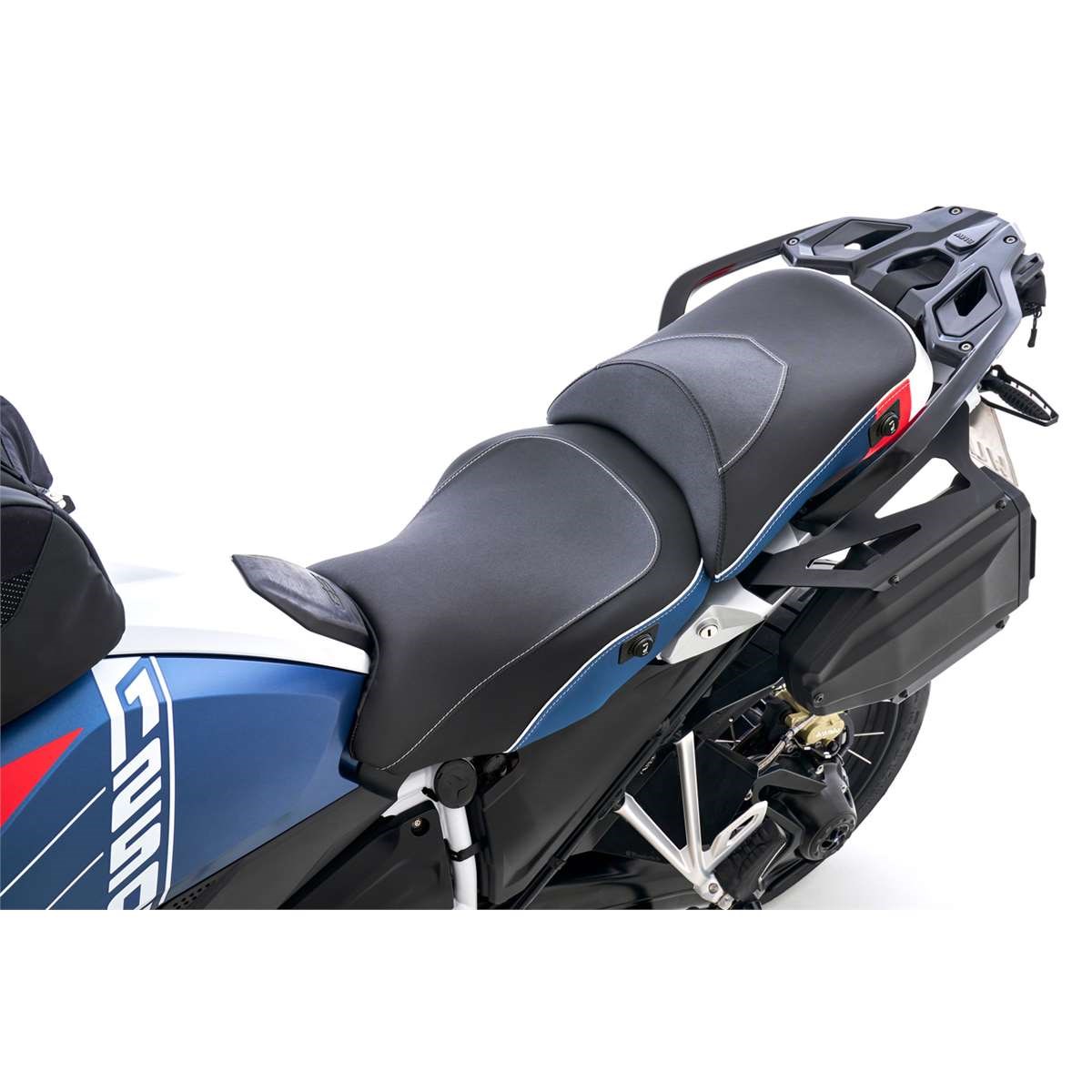 Auch diese heizbare AKTIVKOMFORT Sitzbank fertigen wir mit einer charakteristischen, ergonomischen 3D-Kontur, die den Fahrer mit seinem BMW-Motorrad eins werden lässt. Sie ist für Motorräder bestimmt, die ohne werksseitige Sitzheizung ausgeliefert wurden. Die Steuerung der Heizleistung des hochwertigen Carbon-Heizelements erfolgt komfortabel und sicher mit einem zweistufigen Schalter, der an der linken Sitzflanke positioniert ist – so bleibt die Gashand, wo sie hingehört: Am Lenker. Form und Neigung des aufwändig verarbeiteten Sitzbankkerns, in den das Sitzheizungselement aus Carbon integriert ist, unterstützen die ergonomisch vorteilhafte, natürliche Haltung des Beckens. So ins Motorrad integriert, fährt es sich einfach entspannt und damit aktiv. Und, kein Zweifel, entspanntes Sitzen schafft ein Plus an passiver Sicherheit. Bei unseren ThermoPro Fahrer- und Beifahrersitzbänken liegt die Temperatur der Sitzfläche im Hochsommer in praller Sonne um bis zu 25°C niedriger im Vergleich mit herkömmlichem Bezugsmaterial. Zum Abnehmen der Sitzbank kann die Stromversorgung mit einer Schnellkupplung getrennt werden.