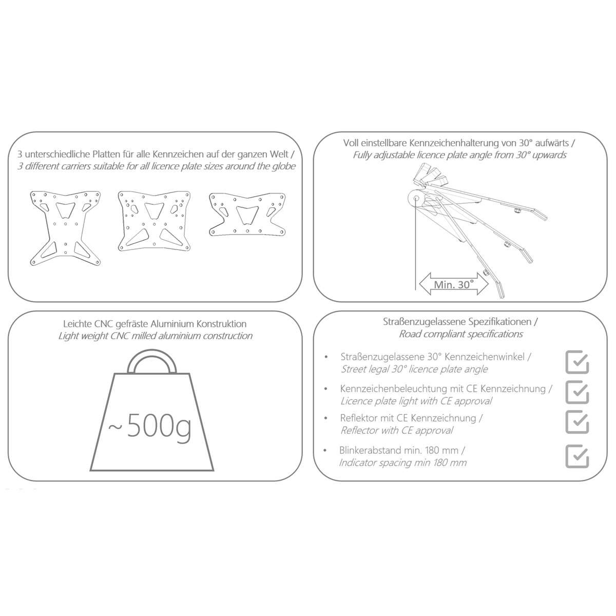 • Voll verstellbarer Nummerntafel-Winkel & Blinkeraufnahme
