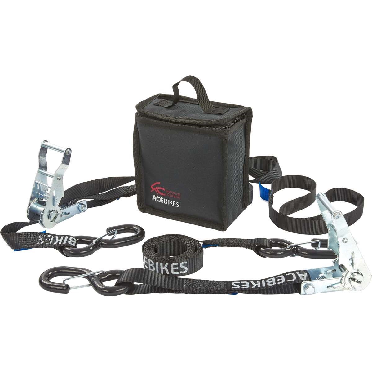 Das Acebikes Spanngurtset mit Ratsche sichert Ihr Motorrad schnell und zuverläßig. Mit den hochwertigen Ratschenspanngurten von Ratchet Kit ? Heavy Duty können Sie natürlich auch mittelschwerer Lasten auf Ihrem Motorrad befestigen. Die stabilen, gummierten Haken der Zurrgurte sind, um noch mehr Sicherheit zu bieten, mit belastbaren Verschlußklammern aus Metall ausgestattet. Das Set ist besonders gut für schwere Motorräder geeignet. Das System der Ratschengurte ist extrem strapazierfähig, das Set selber natürlich langlebig und sehr widerstandsfähig. Das Spanngurtset mit galvanisieren Metallteilen verfügt über extra starke PES- gewobene Gurtschlaufen. Wir liefern diesen Artikel in einer stabilen Tasche, so haben Sie immer alles griffbereit. Das Set beinhaltet neben den 2 Spanngurtratschen auch 2 stabile Zwischenstücke (Gurtschlaufen). So können Sie, nachdem Sie die Gurtschlaufen an der Gabel des Motorrades befestigt haben, die Haken der Spanngurte einfach und schnell durch die Ösen ziehen. Transportsicherung wie man sich diese wünscht: schnell, sicher und einfach in der Handhabung.