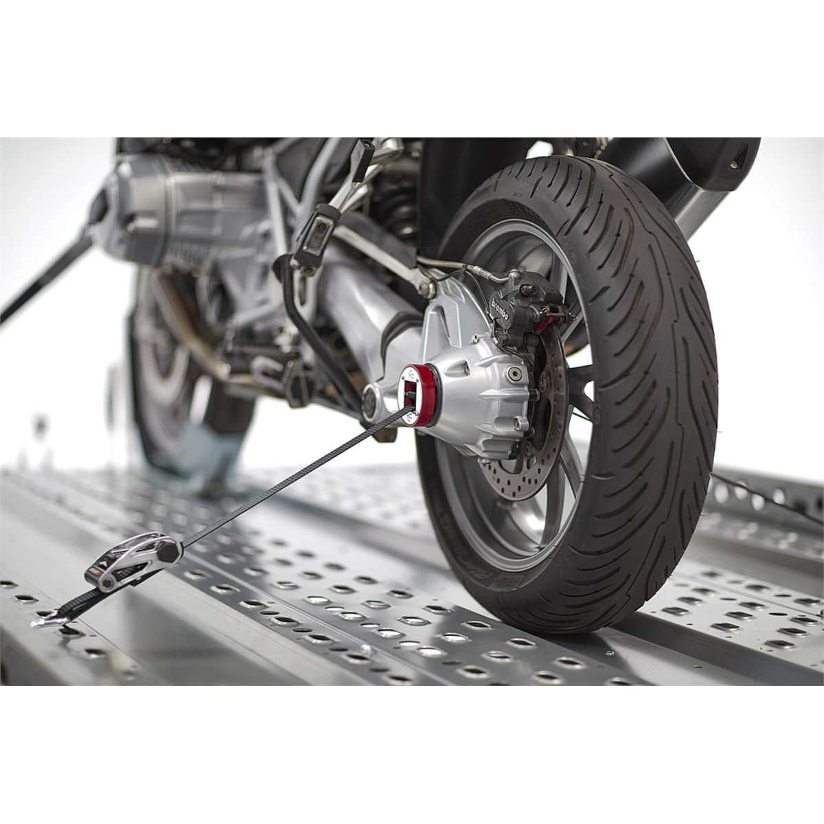 Transport-Befestigungßystem für original BMW-Motorradfelgen mit einem Hinterradachsdurchschnitt von 5,3 cm. Mit dem revolutionären Capstrap-Befestigungßystem für BMW-Motorräder können Sie Ihr Bike sicher und zuverläßig transportieren ohne das Aufhängungßystem des Motorrades zu belasten. Das Capstrap open axle tie down System wird durch die Hinterradachse geführt.