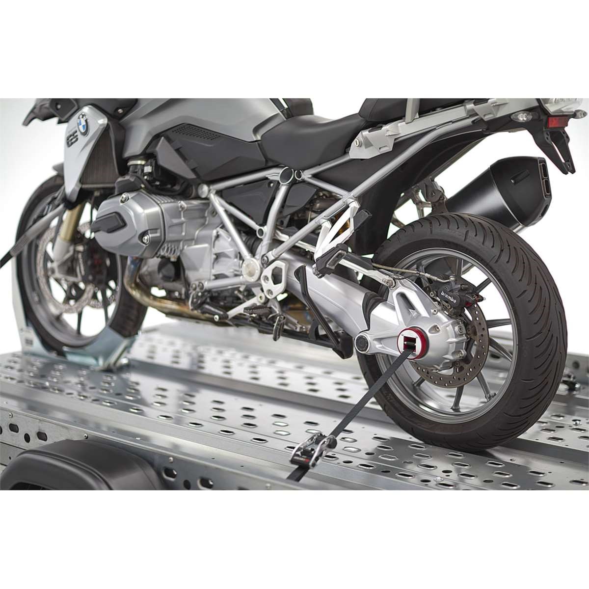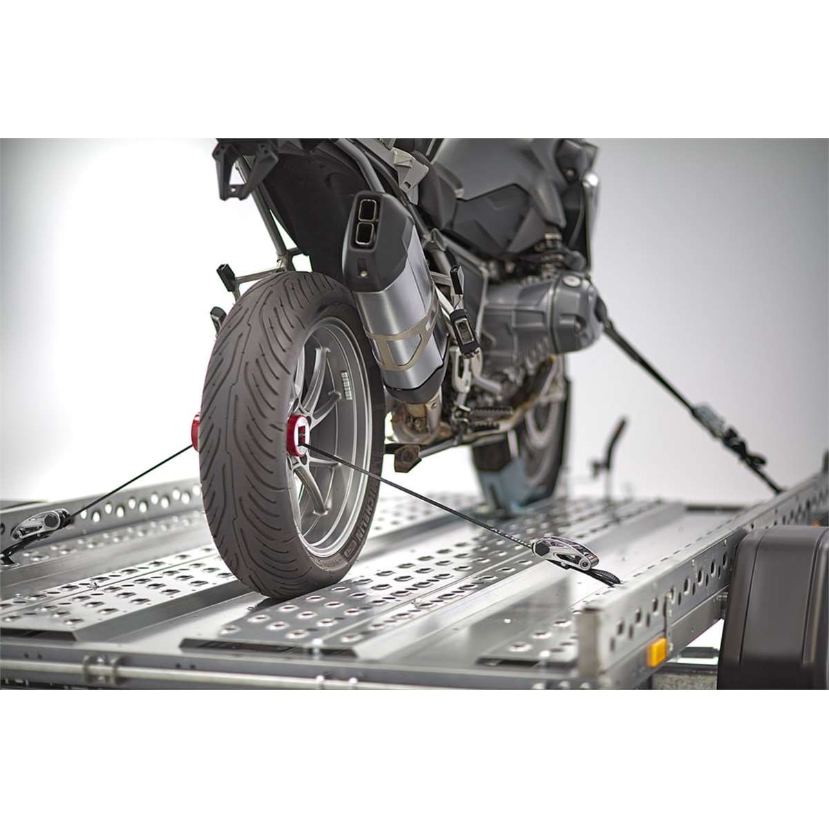 Mit dem Capstrap-Befestigungßystem werden weder der Auspuff noch eventuell befestigte Motorradkoffer belastet, denn die Fixierung des Hinterrades erfolgt außchließlich über die Hinterradachse.