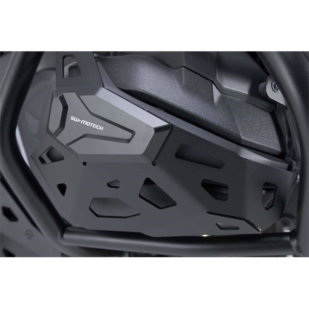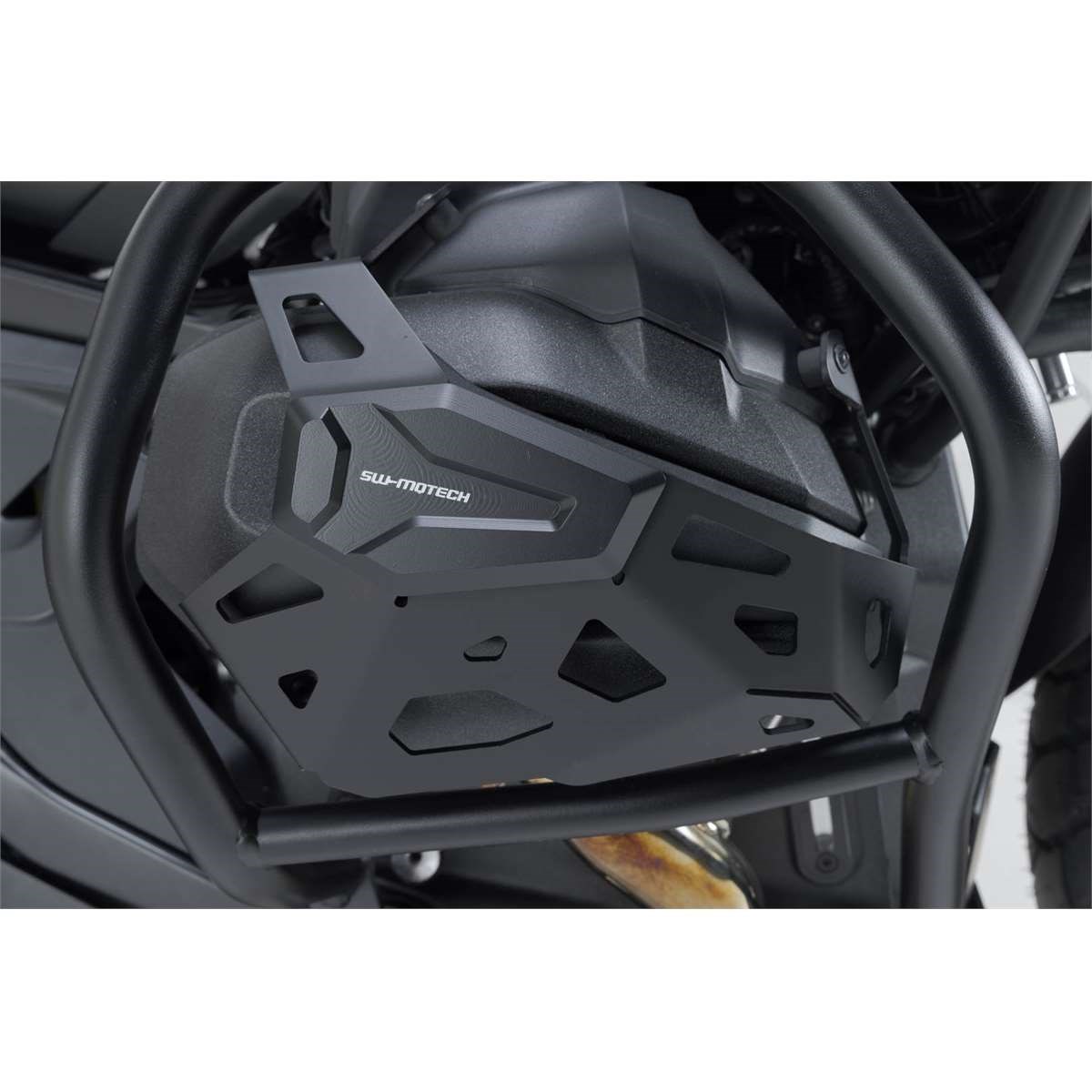 Zum Schutz der Boxer-Ventildeckel gegen Steinschläge und Stürze. Speziell der Form des Ventildeckels angepasst und an der Innenseite mit einer Gummidämpfung versehen. Eine Kombination aus gelasertem, gebürstetem Aluminium Grundrahmen und CNC-gefrästem, schwarz eloxiertem Aluminium-Pad.