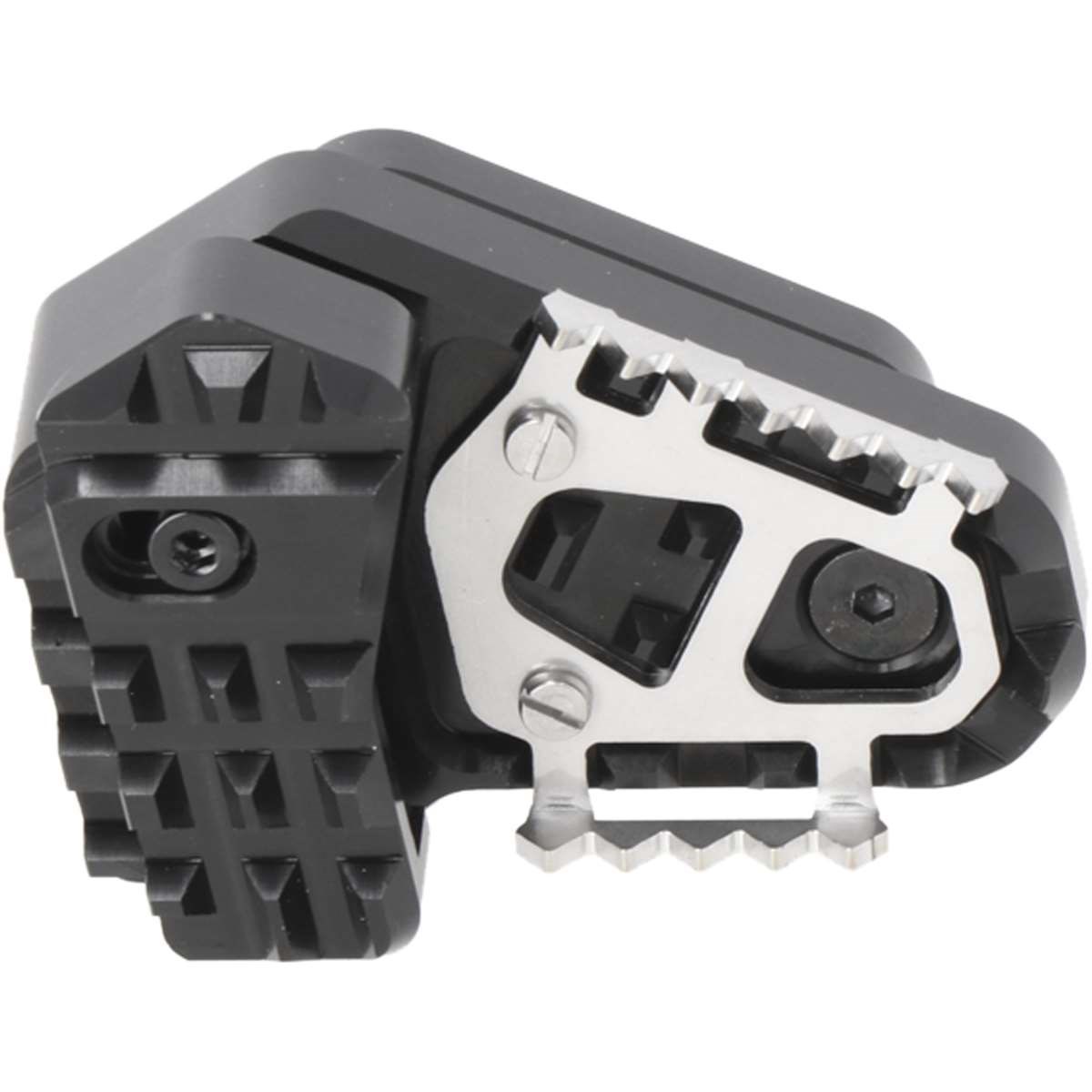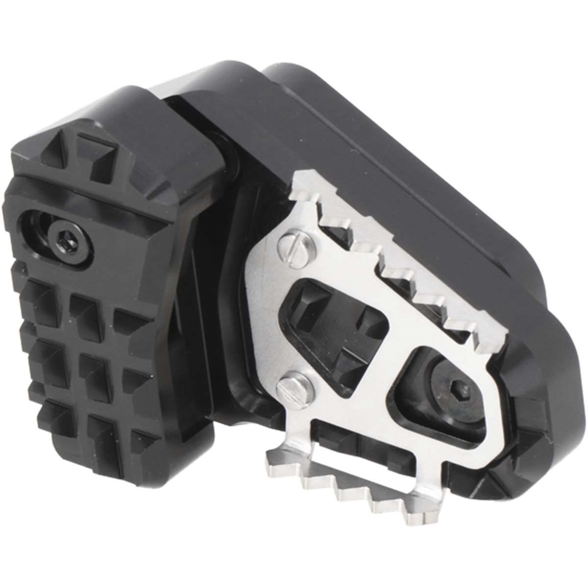 SW-MOTECH fertigt die Erweiterungen aus gefräster und hochfester Aluminiumlegierung mit schwarz eloxierter Oberfläche und mit einem Auftrittsblech in Edelstahl. Für eine optimale Anpassung an die Ergonomie lässt sich die Erhöhung des Bremshebelauftritt in zwei Stufen von 22 oder 27 Millimetern einstellen.