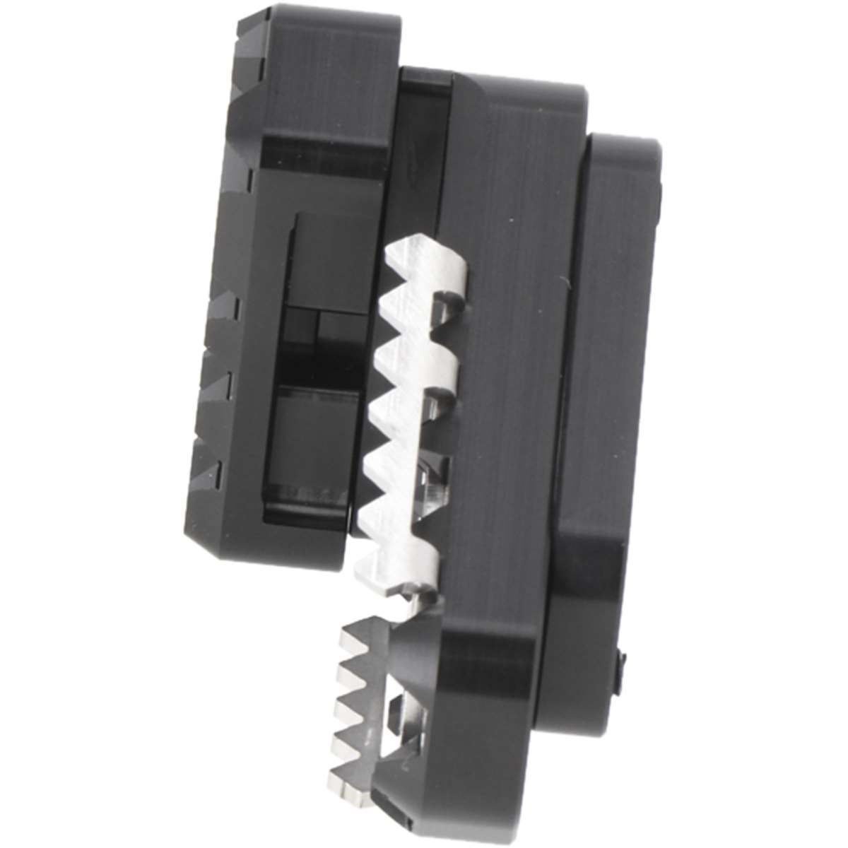 Zusätzlich zur Erhöhung verfügt die Fussbremshebel-Erweiterung über eine verbreiterte Auflagefläche. Diese ist mit einer gezahnten Oberfläche versehen und bietet dadurch besseren Halt bei verschmutzter oder nasser Oberfläche des Hebels.