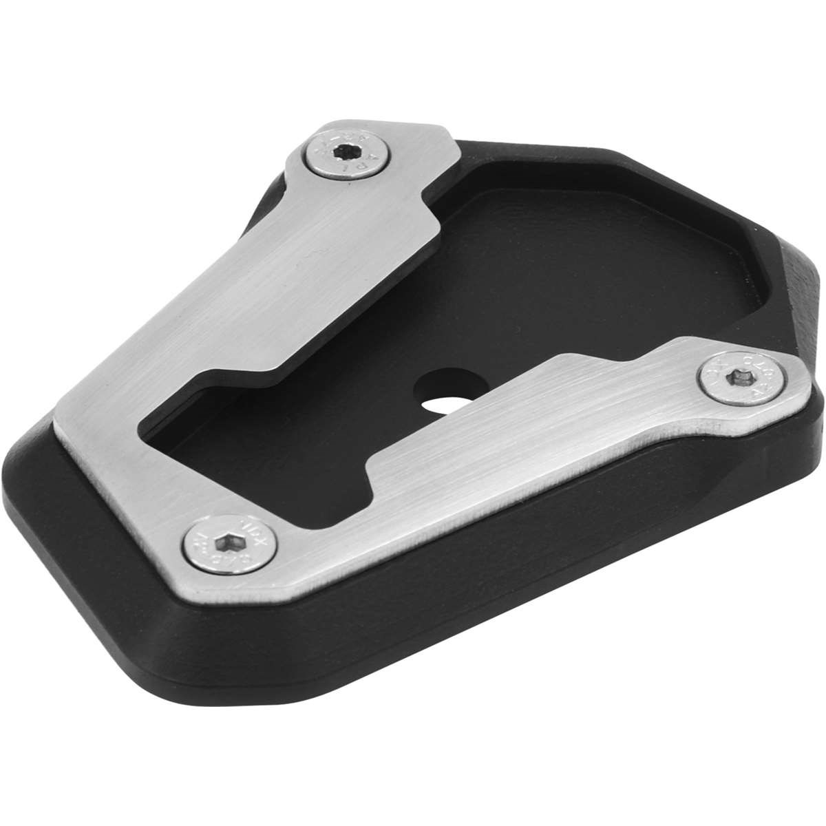 Der Seitenständerfuss erhöht die Auflagefläche des Seitenständers und verbessert die Standfestigkeit auf unbefestigten und weichen Untergrund. Er wird aus hochfesten Aluminium CNC-gefräst und schwarz eloxiert. Das Spannblech sowie die Schrauben sind aus Edelstahl, somit bietet dieser Seitenständerfuss eine lange Lebensdauer sowohl optisch als auch funktional.