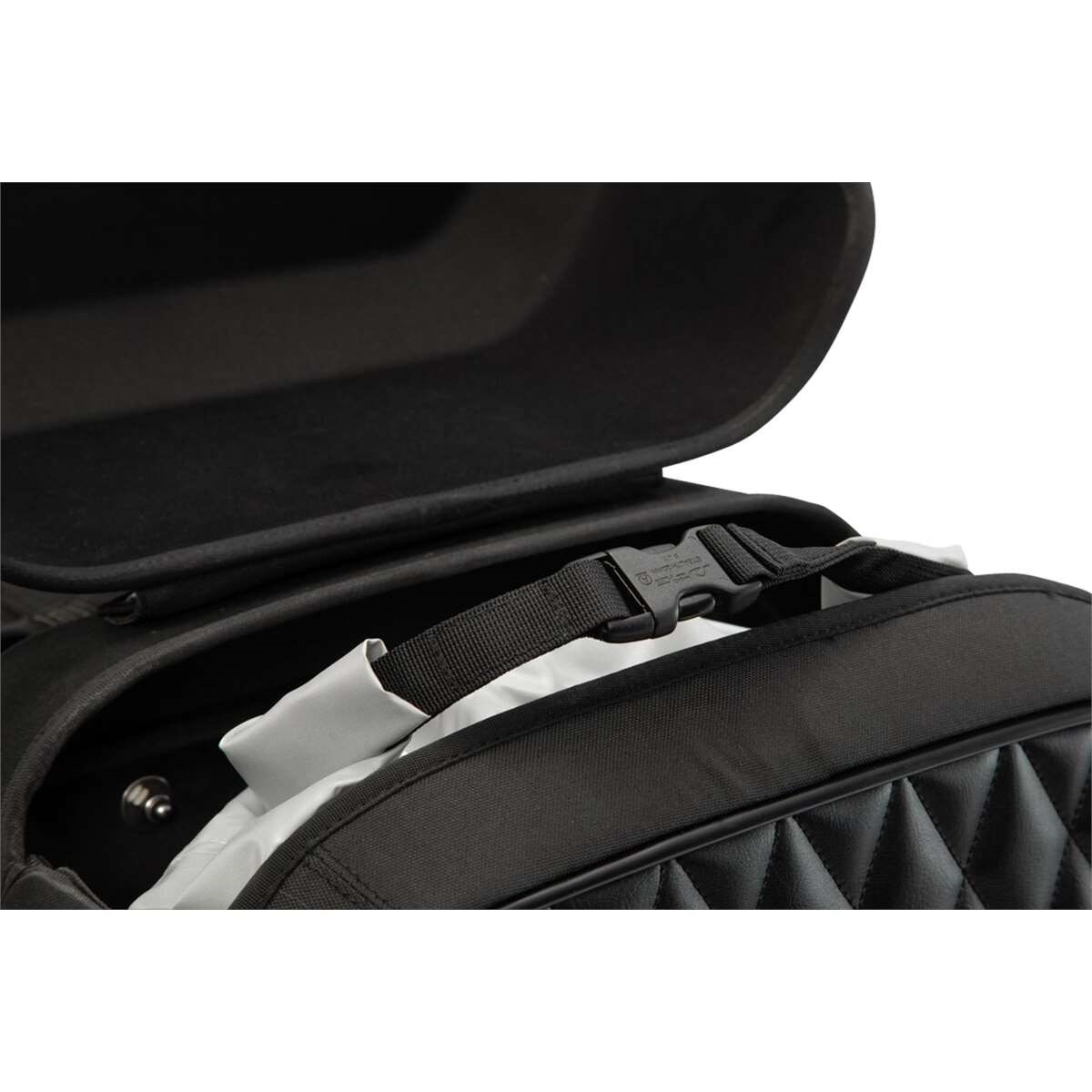 Die geräumige Seitentasche ist komplett in Schwarz gehalten. Das Außenmaterial ist eine Kombination aus Textilgewebe und genarbtem Kunstleder mit aufwendiger Rautensteppung. Für eine Extraportion Komfort verfügt die Seitentasche über einen integrierten Tragegriff. Die Tasche hat zusätzlich ein MOLLE-System zur Befestigung von Zusatztaschen. Langfinger und Regen haben keine Chance: Die integrierte Diebstahlsicherung, der abschließbare Deckel und die mitgelieferte, wasserdichte Innentasche schützen dein Gepäck.