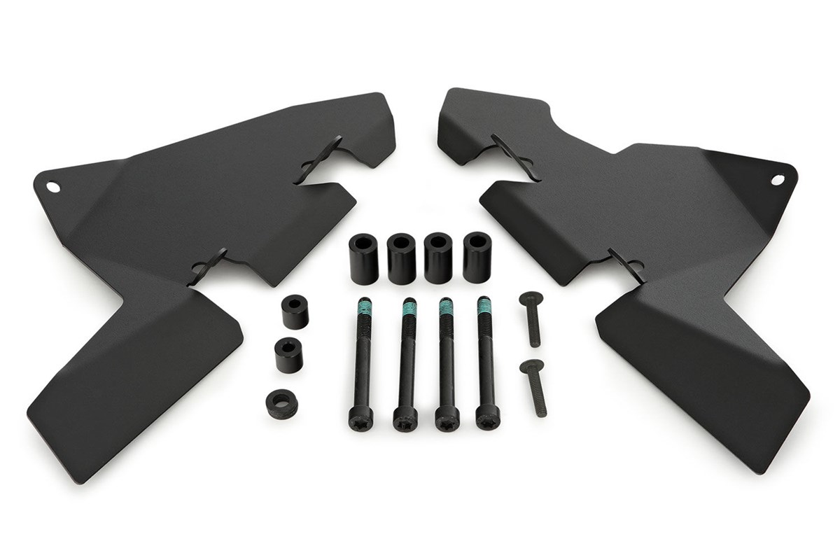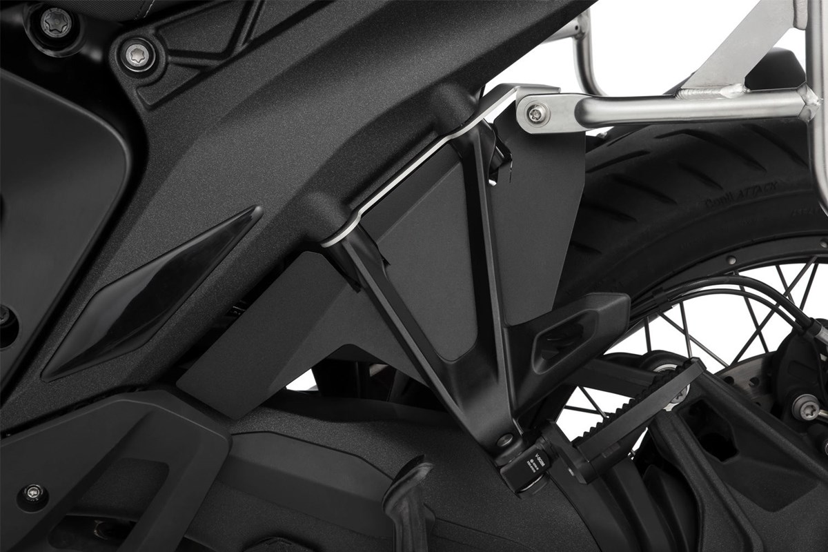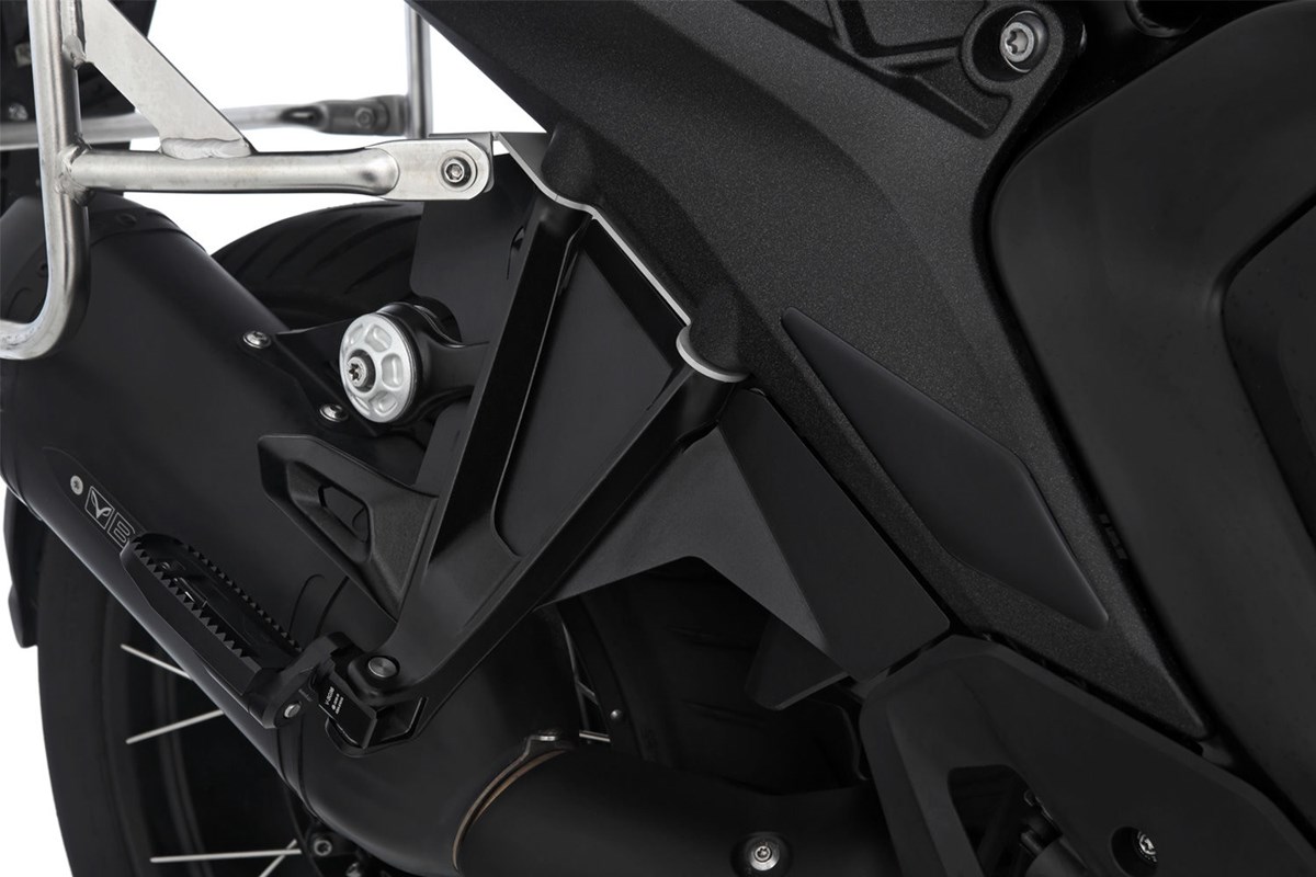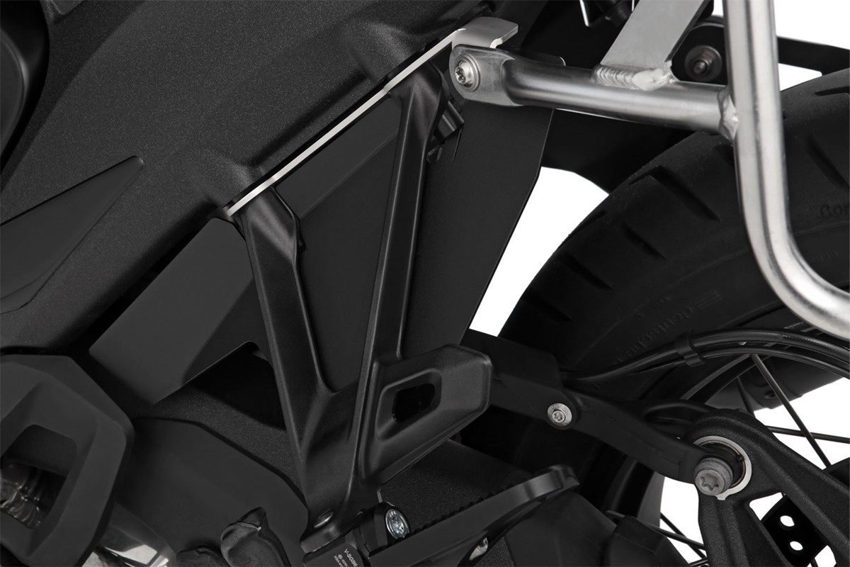 Die beiden Sozius-Spritzschutzprotektoren für die rechte und die linke Seite sind maßgeschneidert. Sie verschließen die beiden seitlichen Öffnungen des Rahmenhecks im Bereich der Beifahrerfußrasten passgenau. Vom Hinterrad aufgewirbelter Schmutz, Steinschlag, Spritzwasser oder Gischt werden effektiv aufgefangen bzw. innerseitig abgeleitet, bevor sie den Beifahrer erreichen. Gleichzeitig wird die Verschmutzung der Maschine spürbar reduziert. Das durch die Aussparung dynamische Design bleibt dezent und wirkt im Zusammenspiel mit der Strukturbeschichtung am Motorrad unaufdringlich und stimmig.