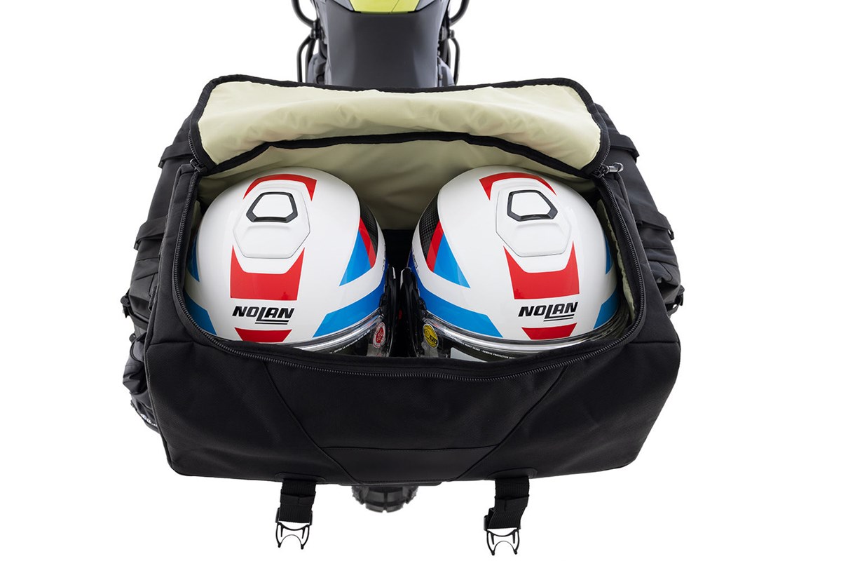 Es trägt dazu bei, das Bike schmal zu halten. Dies ist genauso von Vorteil, wie das verwendete, hochwertige, verschleiß- und abriebfeste Gewebe, wenn man sich im Gelände den Weg durch Gestrüpp bahnen muss. Trotz des geringen Eigengewichts punktet das X-BAG Softcase, dessen Verriegelung am Träger abschließbar ist, mit beachtliche 40 Litern Stauvolumen und satten 10 Kilogramm Zuladung. Das MOLLE-System sowie die acht weiteren, verstärkten Befestigungspunkte dienen zum einfachen Anbringen weiterer geeigneter Taschen oder Gepäckstücke. Das Topcase ist dank des hervorragenden Gewebes bereits wasserfest. Das Regencover machen es bei Bedarf vollends wasserdicht. Die reflektierende Elemente sorgen bei Dunkelheit und Regen für gute Sichtbarkeit und Sicherheit.