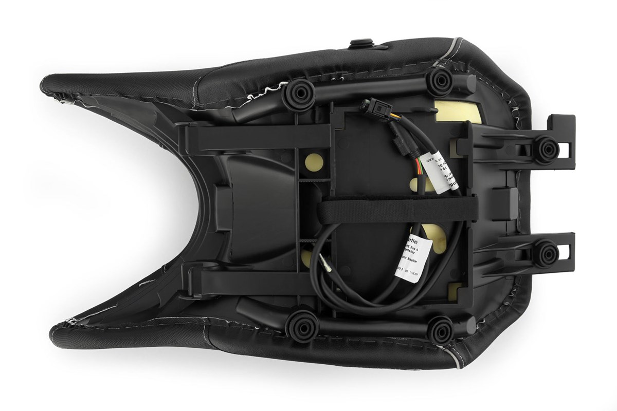Die Steuerung der Heizleistung des hochwertigen AKTIVKOMFORT Sitzheizelements erfolgt komfortabel und sicher mit einem zweistufigen Schalter, der an der linken Sitzflanke positioniert ist – so bleibt die Gashand, wo sie hingehört: Am Lenker. Form und Neigung des aufwändig verarbeiteten Sitzbankkerns, in den das Sitzheizungselement integriert ist, unterstützen die ergonomisch vorteilhafte, natürliche Haltung des Beckens. So ins Motorrad integriert, fährt es sich einfach entspannt und damit aktiv. Und, kein Zweifel, entspanntes Sitzen schafft ein Plus an passiver Sicherheit. Bei unseren ThermoPro Fahrer- und Beifahrersitzbänken liegt die Temperatur der Sitzfläche im Hochsommer in praller Sonne um bis zu 25°C niedriger im Vergleich mit herkömmlichem Bezugsmaterial. Zum Abnehmen der Sitzbank kann die Stromversorgung mit einer Schnellkupplung getrennt werden.