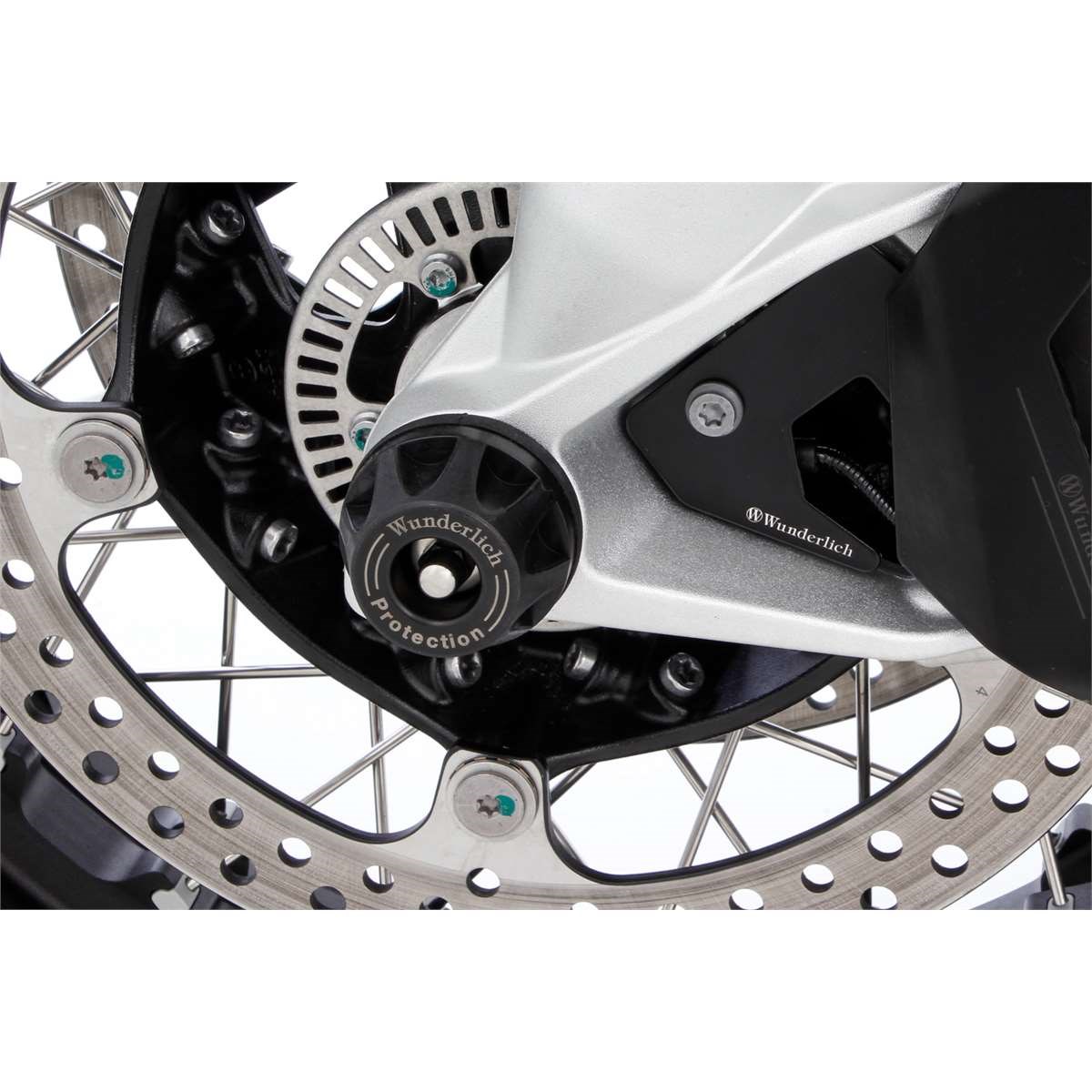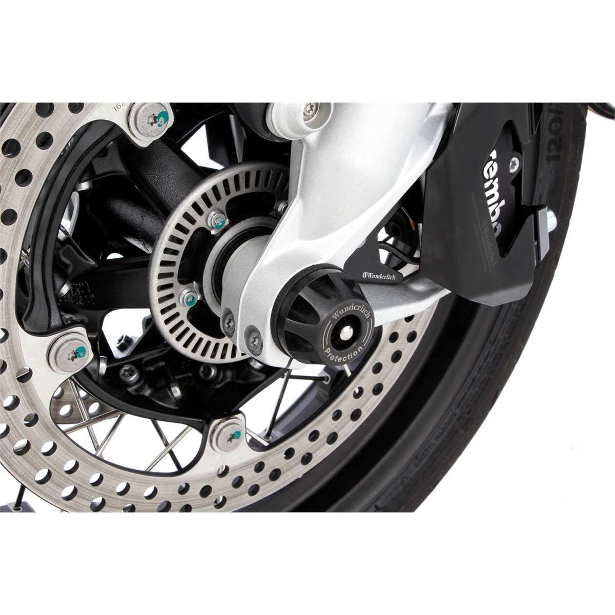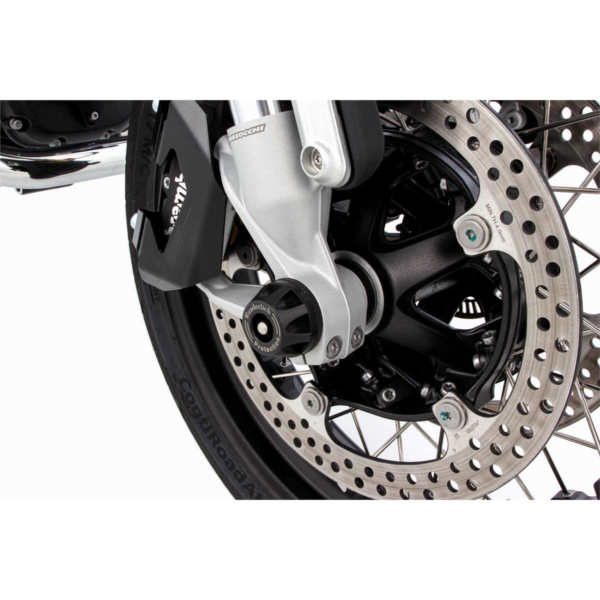 Die Achs-Schutzpads sorgen im Falle des Umfallens des Motorrads oder bei einem Sturz dafür, dass die Gabel, die Radachse und Bremsanlage effektiv vor Beschädigungen geschützt werden.