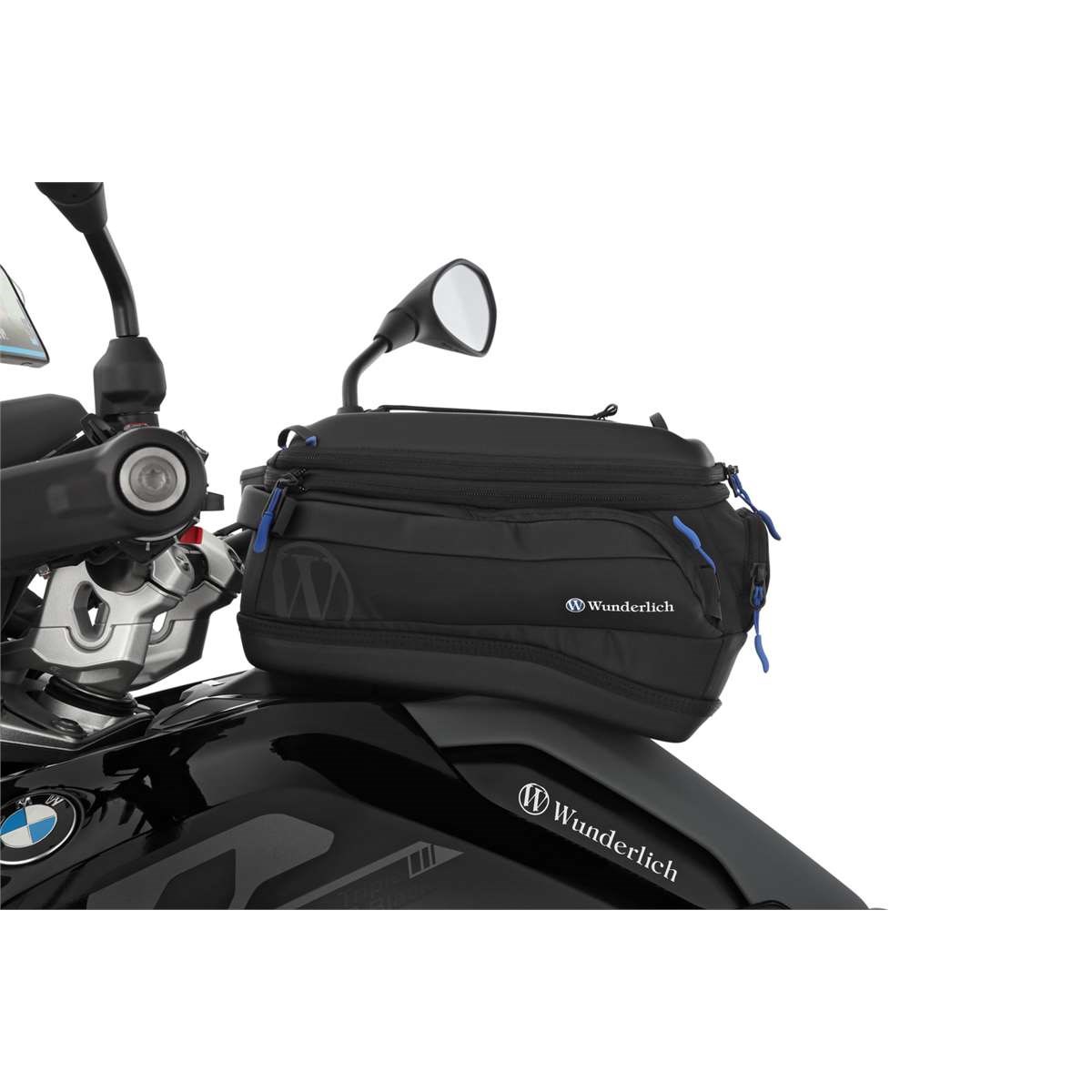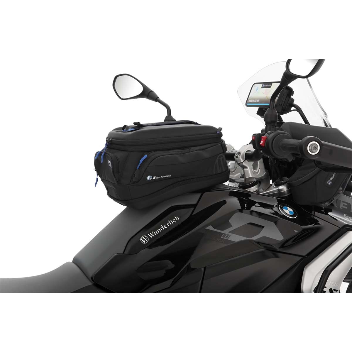 Das Handling ist ausgesprochen komfortabel: Beim Befestigen wird der CLICK BAG von oben in den Tankring eingesetzt, bis das Schloss automatisch verriegelt. Mit einem Riemen lässt sich die Arretierung mit einem Zug lösen. So lässt sich der Tankrucksack im Handumdrehen zum Tanken abnehmen. Die robuste Verschlussmechanik kann in Längsrichtung nach vorne oder hinten verschoben werden. So kann die Position des Tankrucksack auf dem Tank in einem 20 mm-Raster in drei Position den individuellen Bedürfnissen und Gegebenheiten angepasst werden, die sich aus der Tankform oder dem Lenkeinschlag ergeben.