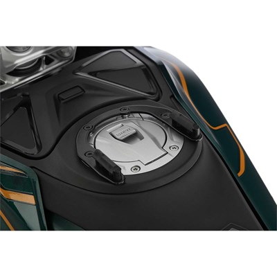Der modellspezifische, sogenannte Tankring bildet die solide Basis zur sicheren, mechanischen Arretierung der CLICK BAG Tankrucksäcke. Zum Befestigen wird der CLICK BAG von oben in die beiden Führungen des Tankrings eingesetzt, bis das Schloss automatisch verriegelt. Mit einem Riemen am Tankrucksack lässt sich die Arretierung mit einem Zug lösen. So kann der Tankrucksack im Handumdrehen - zum Beispiel zum Tanken – abgenommen werden.