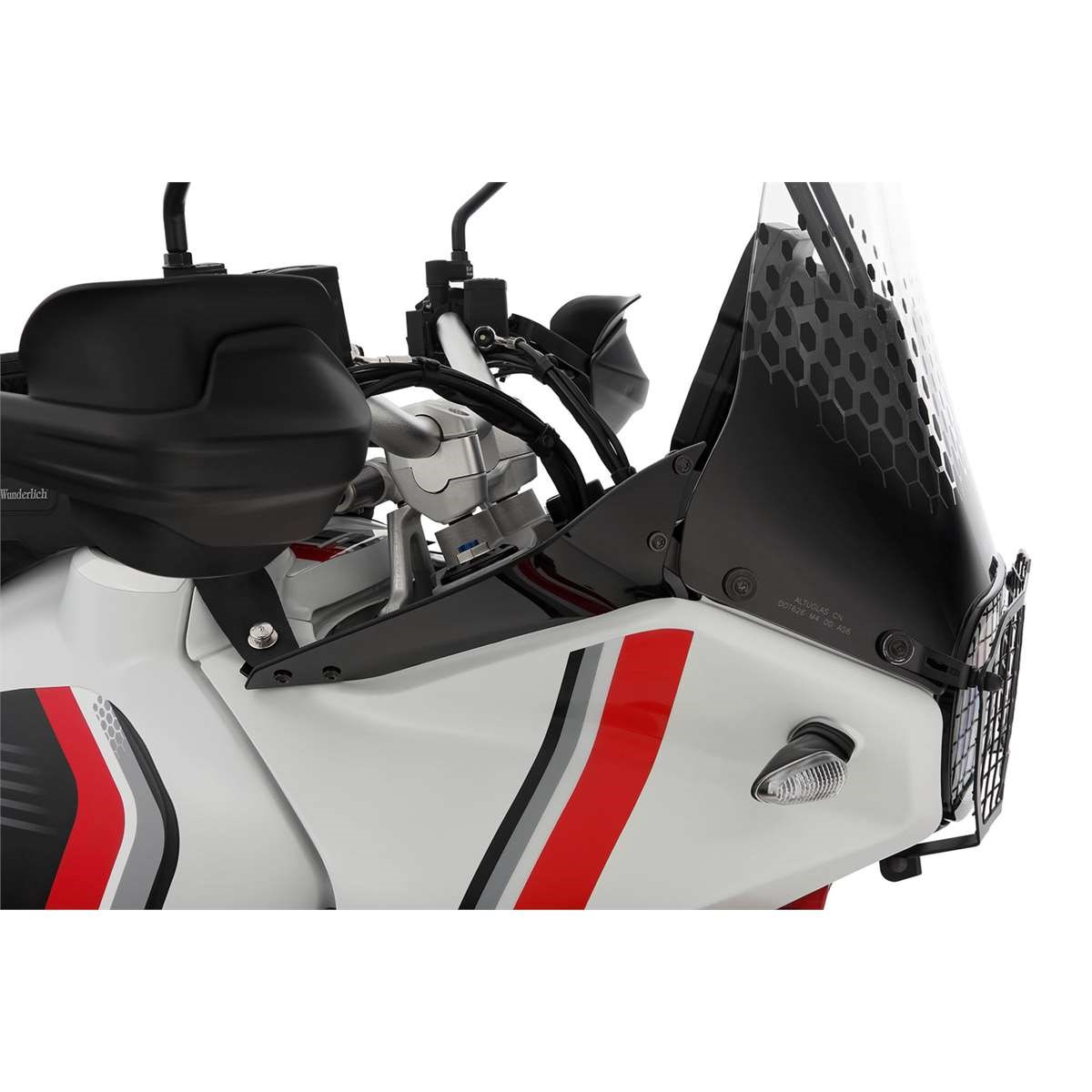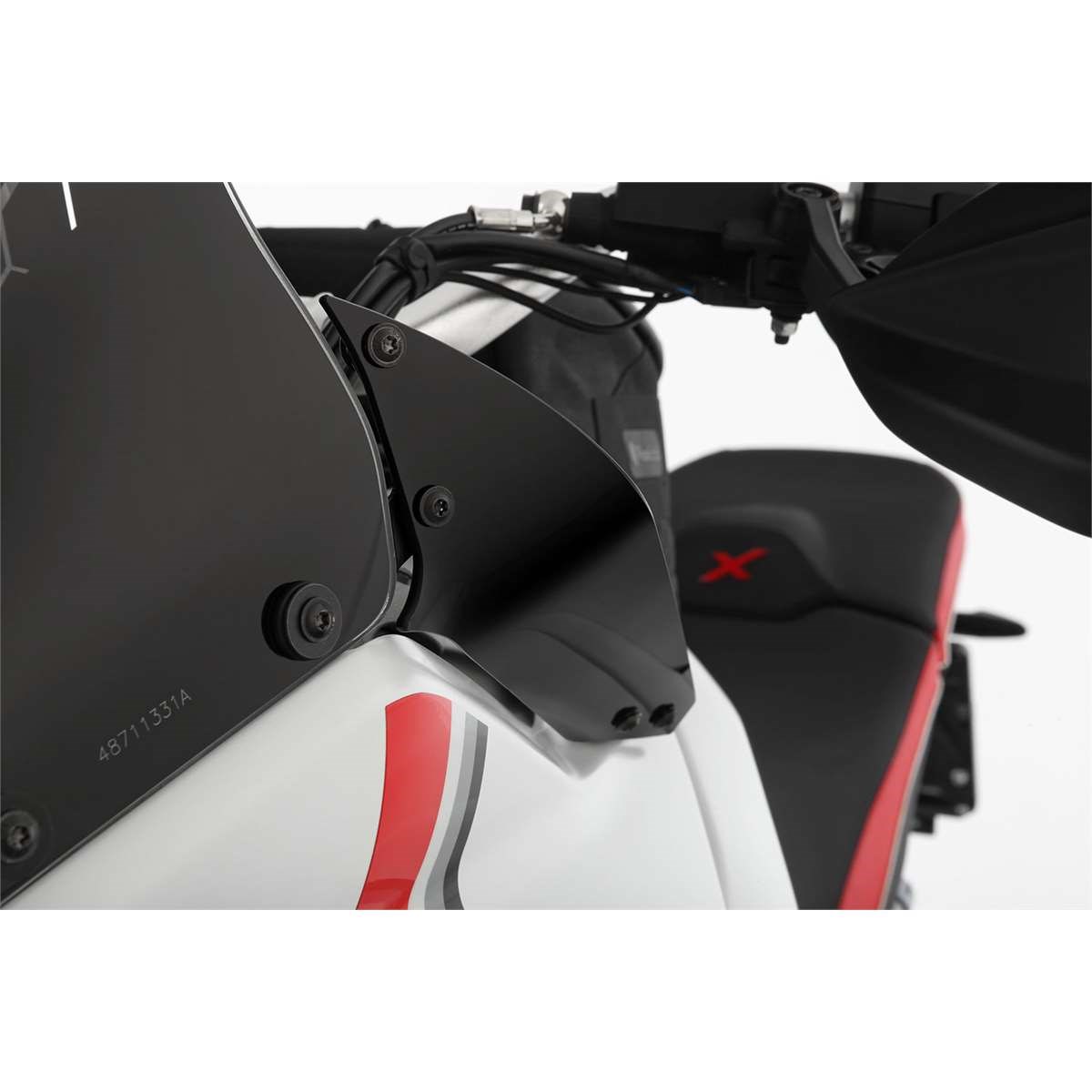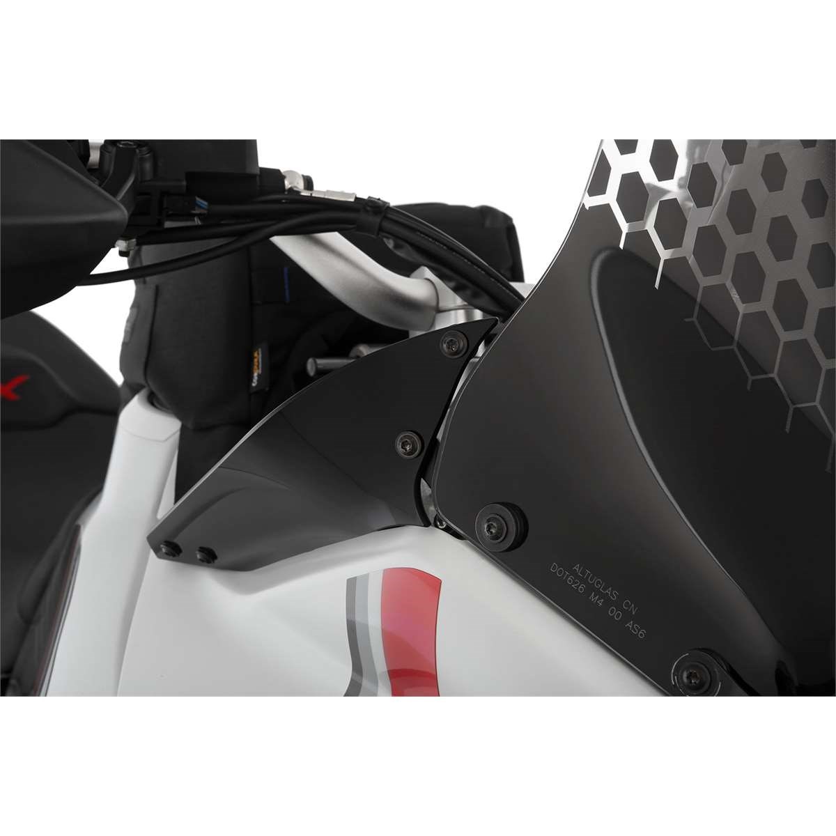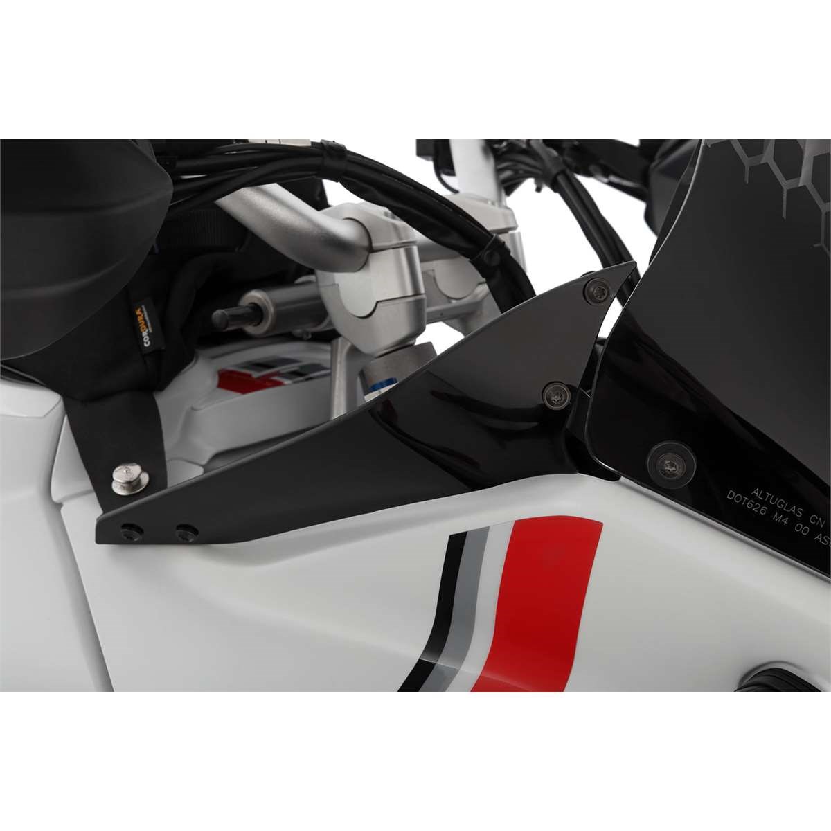 Diese Windabweiser steigern den Fahrkomfort spürbar und unterstützen einen entspannten Fahrstil – nicht nur auf langen Strecken. Beides dient der Fahrsicherheit. Bei den Flaps handelt es sich um effiziente, aerodynamisch integrierte Ergänzungen zur Original-Scheibe oder unserem für die DesertX/DesertX Rally entwickelten FLOWJET. Die Windabweiser sind rechts und links im unteren Bereich der Scheibe angeordnet. Sie lenken den Fahrtwind so, dass Verwirbelungen spürbar gedämpft, reduziert, beziehungsweise gänzlich eliminiert werden können.
