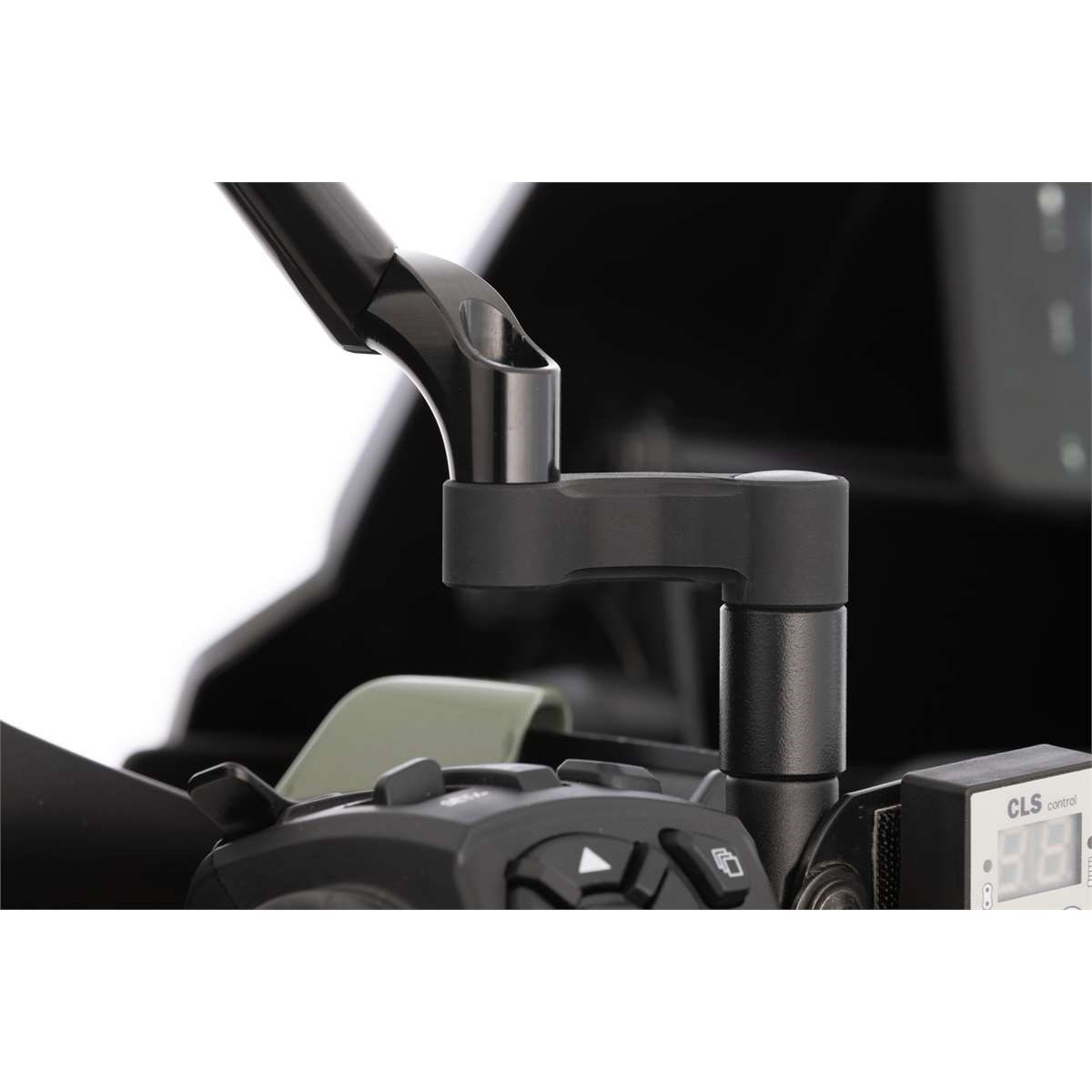 Häufig ist die Sicht durch die Spiegel auf das rückwärtige Verkehrsgeschehen durch die eigene Statur behindert. Dies kann verschiedene Gründe haben und trifft auf großgewachsene Fahrer, aber auch auf jene, die voluminöse Motorradschutzkleidung tragen, oder auch bei Fahrten mit Sozius, der in der Regel höher sitzt, besonders zu. Dies kann zu gefährlichen Situationen im Straßenverkehr führen. Unsere Zusatzerhöhung für Ihre Spiegel trägt dazu bei solche Situationen zu entschärfen: Wenn Sie Ihre „Rücksicht“ und Ihre eigene Sicherheit beim Motorradfahren mit wenig Aufwand deutlich verbessern möchten, empfehlen wir das Kombinieren unserer Spiegelverbreiterung mit dieser Zusatzerhöhung, denn sie hebt Ihre Spiegel um 25 mm an. Das Set enthält zwei Zusatzerhöhungen, die sich einfach montieren lassen.