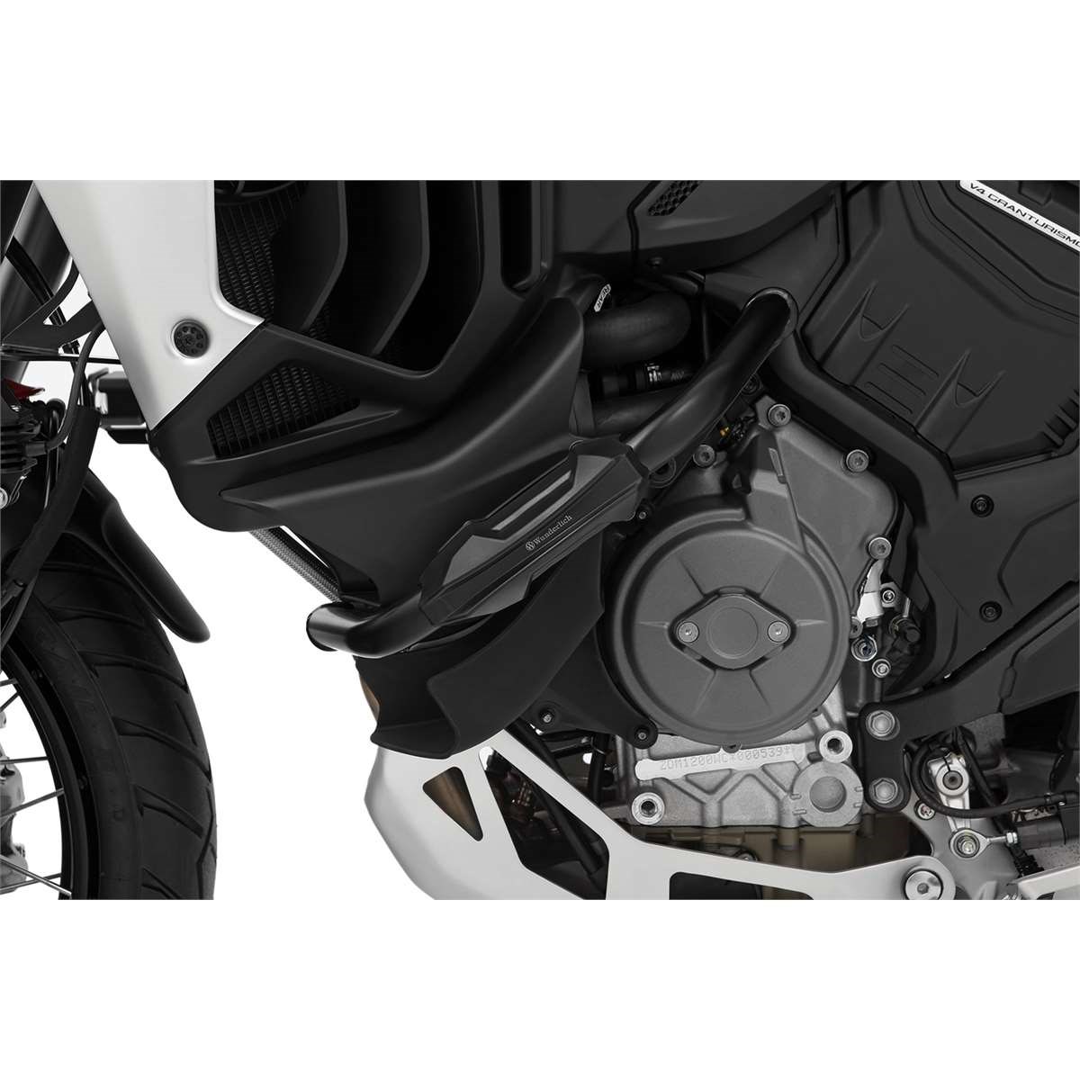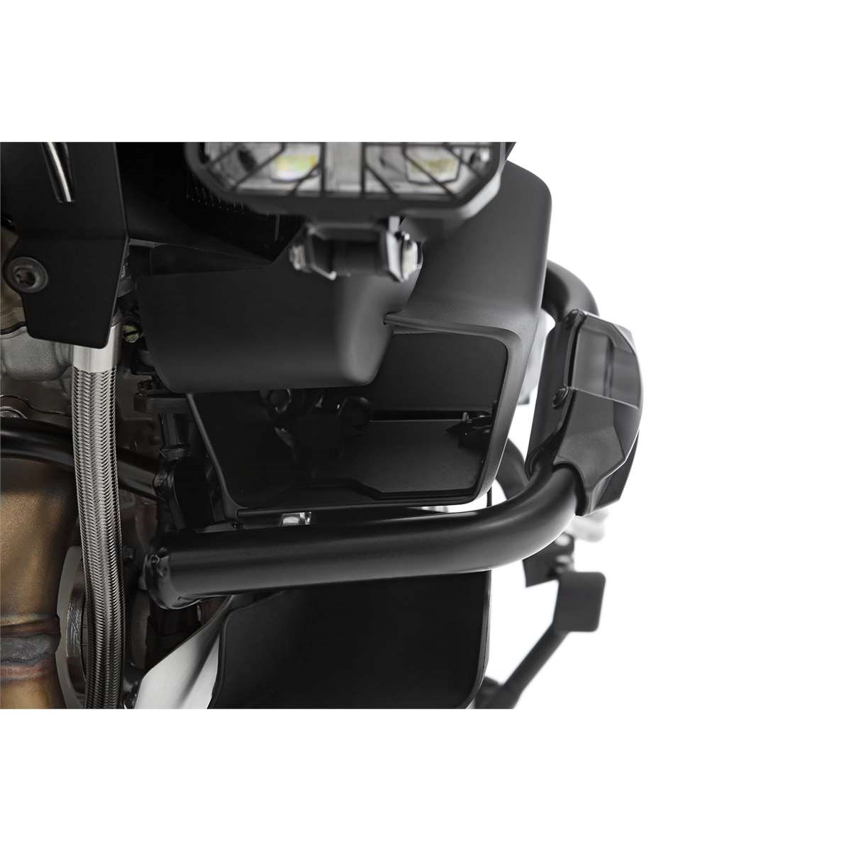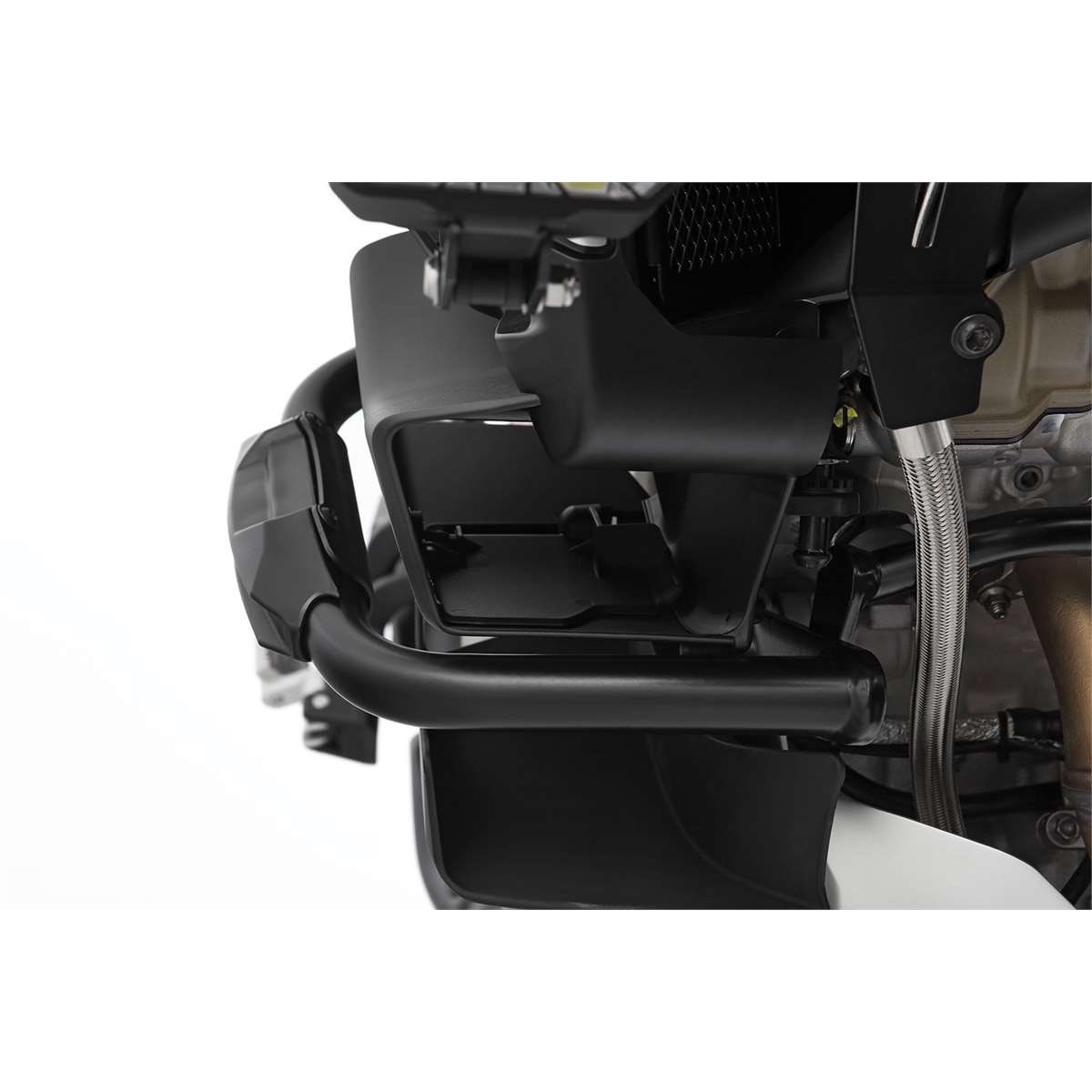 Auch bei diesem Motorschutzbügelkonzept stand die maximale Schutzwirkung im Vordergrund der Entwicklung. Durch die Geometrie des kompakten, dreiteiligen Schutzbügels werden der Hochleistungsmotor und die Aggregate zuverlässig geschützt. Er besteht aus einem Schutzbügel für rechts und links mit je zwei Montagepunkten sowie einer Verbundstrebe. Der maßgeschneiderte Schutzbügelverbund schmiegt sich eng an und gewinnt durch seine gedrungene Struktur zusätzlich an Stabilität und Steifigkeit. Er wird an zwei ausgewählten Anschraubpunkten solide verschraubt. Die bei einem Sturz oder Umfaller auftretenden Momente und Kräfte werden damit auf insgesamt vier Punkte verteilt. Das reduziert die Belastungsspitzen beim Auftreffen äußerer Kräfte. Der Motorschutzbügel reduziert so die Gefahr von Beschädigungen bei einem Umfaller oder Sturz.