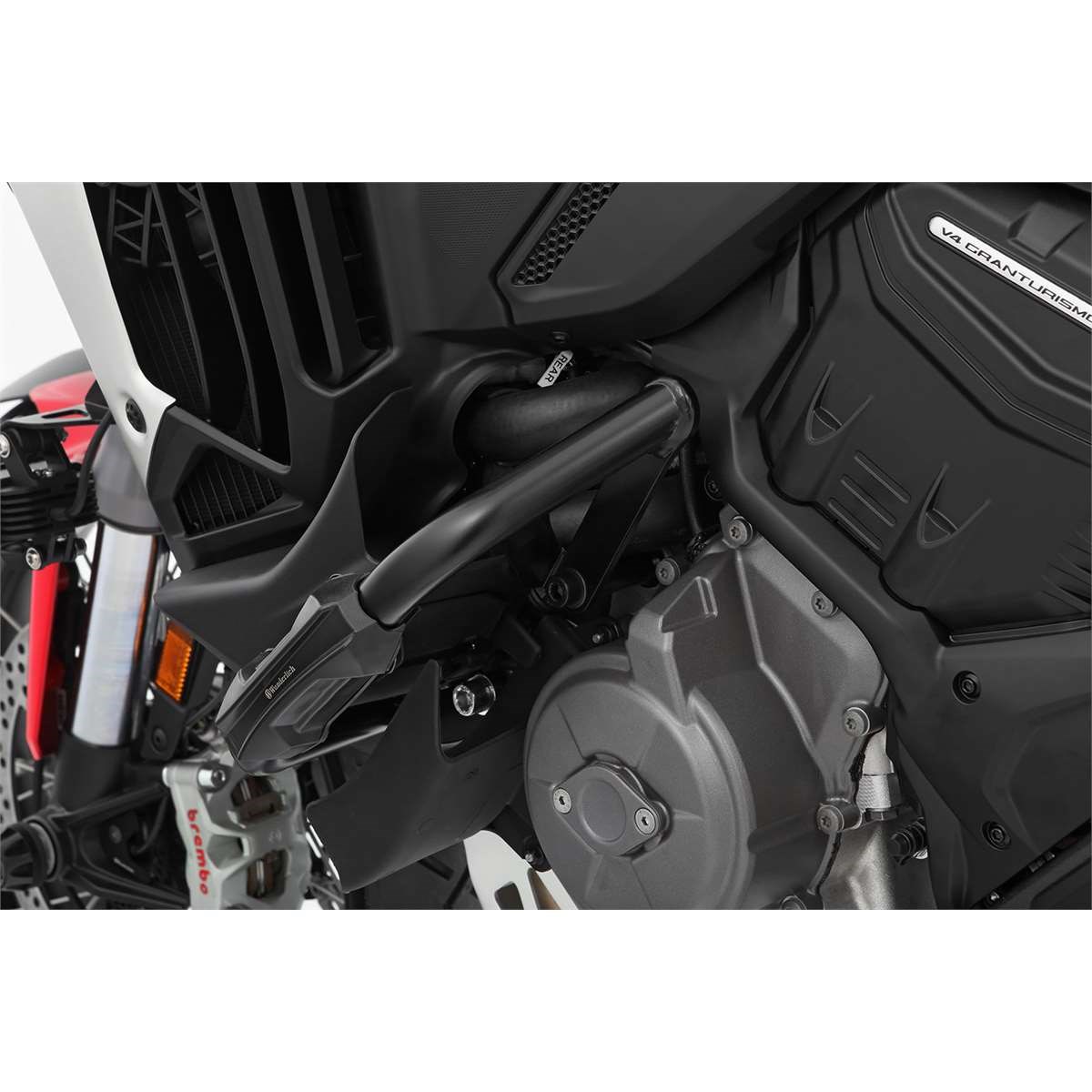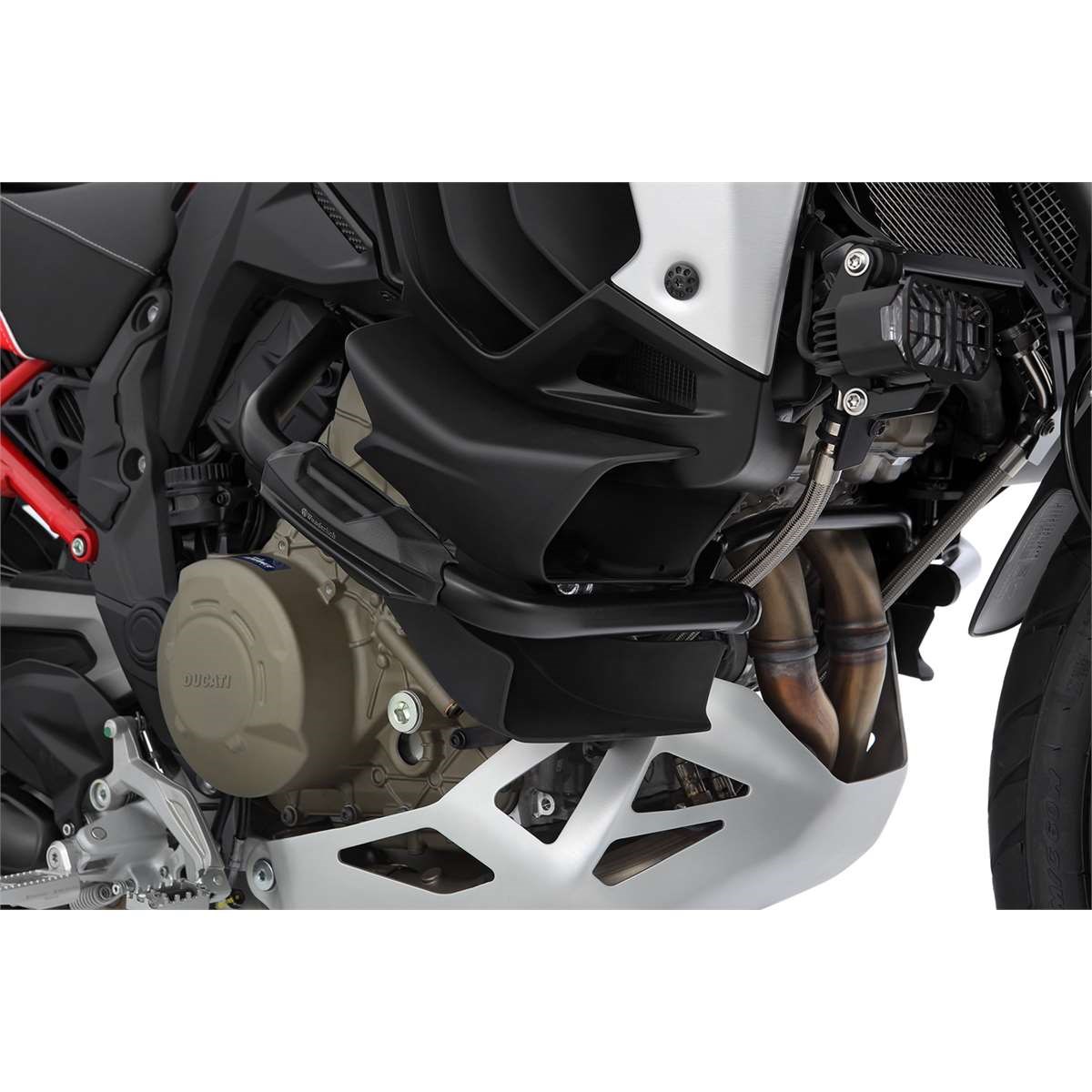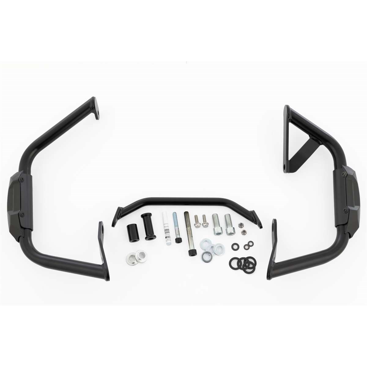 Auch bei diesem Motorschutzbügelkonzept stand die maximale Schutzwirkung im Vordergrund der Entwicklung. Durch die Geometrie des kompakten, dreiteiligen Schutzbügels werden der Hochleistungsmotor und die Aggregate zuverlässig geschützt. Er besteht aus einem Schutzbügel für rechts und links mit je zwei Montagepunkten sowie einer Verbundstrebe. Der maßgeschneiderte Schutzbügelverbund schmiegt sich eng an und gewinnt durch seine gedrungene Struktur zusätzlich an Stabilität und Steifigkeit. Er wird an zwei ausgewählten Anschraubpunkten solide verschraubt. Die bei einem Sturz oder Umfaller auftretenden Momente und Kräfte werden damit auf insgesamt vier Punkte verteilt. Das reduziert die Belastungsspitzen beim Auftreffen äußerer Kräfte. Der Motorschutzbügel reduziert so die Gefahr von Beschädigungen bei einem Umfaller oder Sturz.