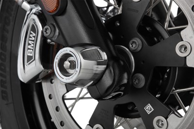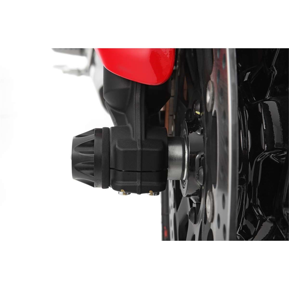 Die Achs-Schutzpads sorgen im Falle des Umfallens des Motorrads oder bei einem Sturz dafür, dass die Gabel, die Radachse und Bremsanlage effektiv vor Beschädigungen geschützt werden.