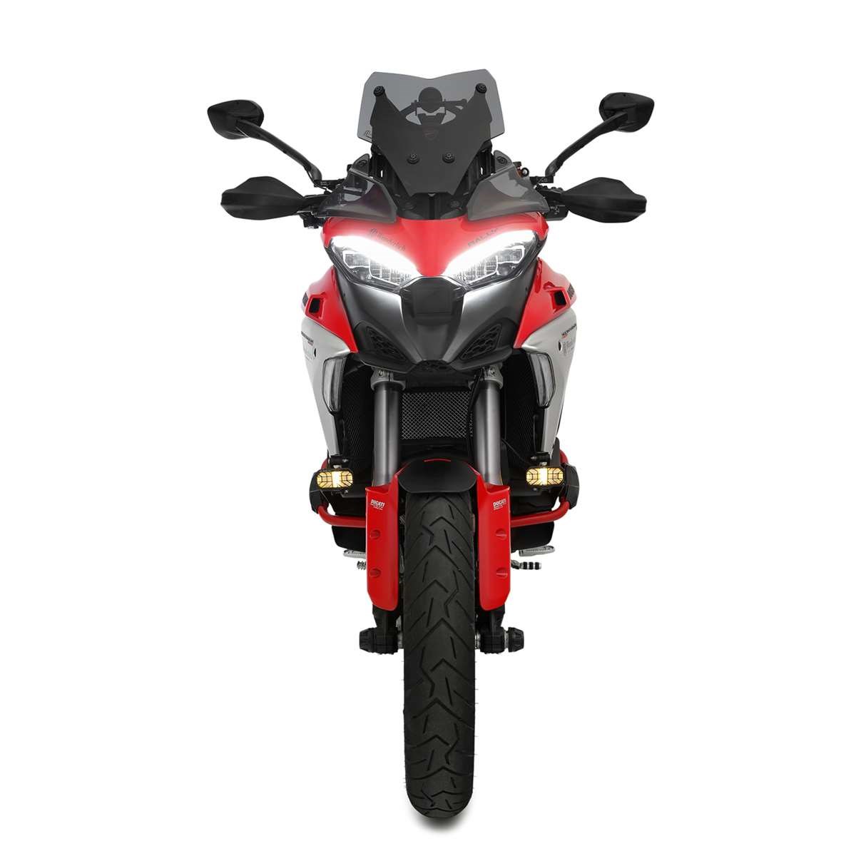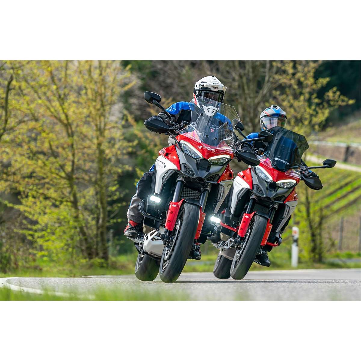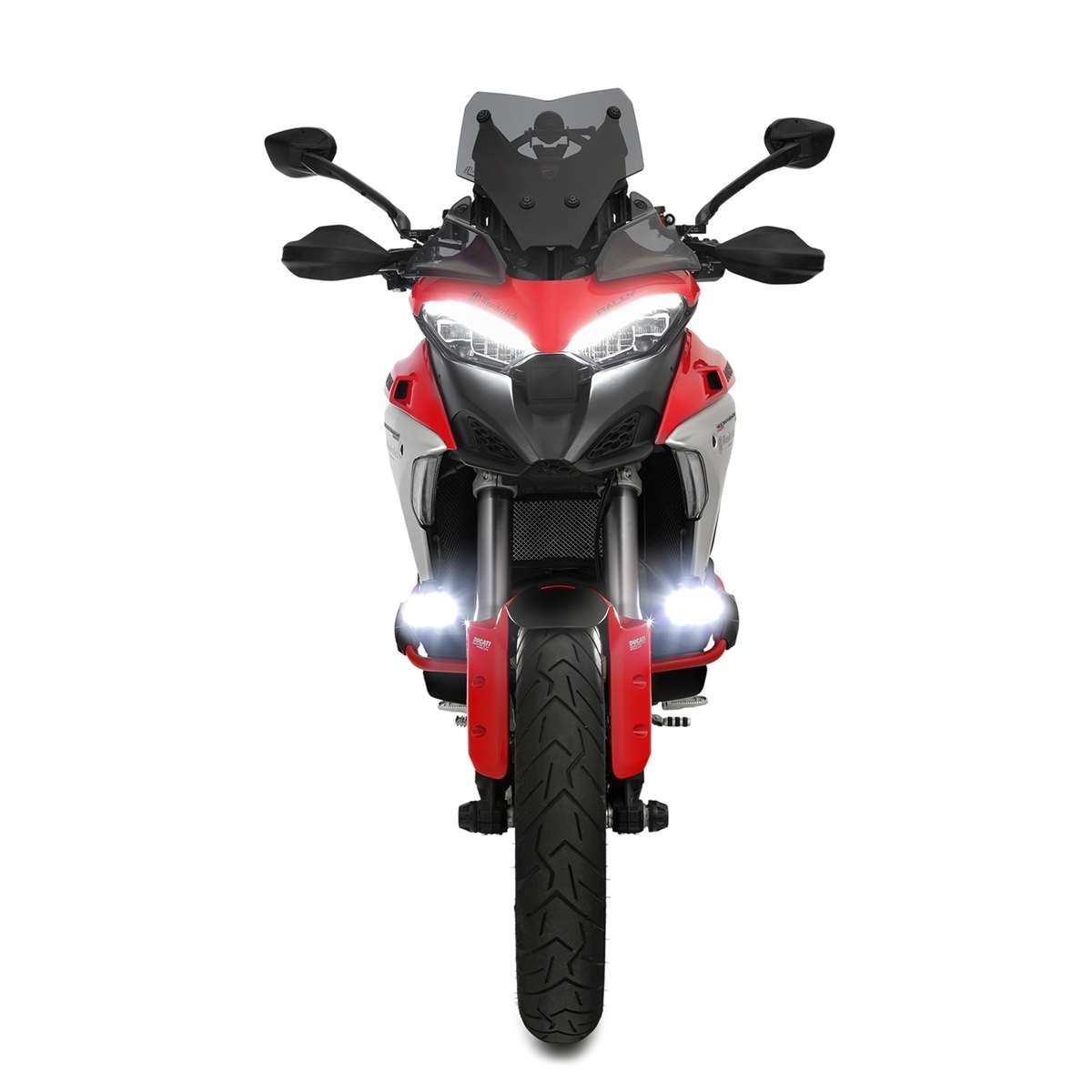 Die Bedienung erfolgt mit einem beleuchteten Schalter bequem vom Lenker aus. Die Lichtfarbe entspricht der der Hauptscheinwerfer der Multistrada V4. Der Einbau erfolgt Plug & Play.
