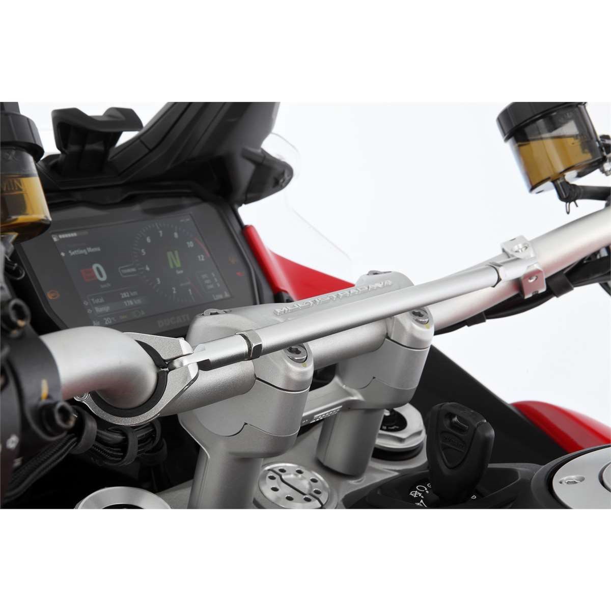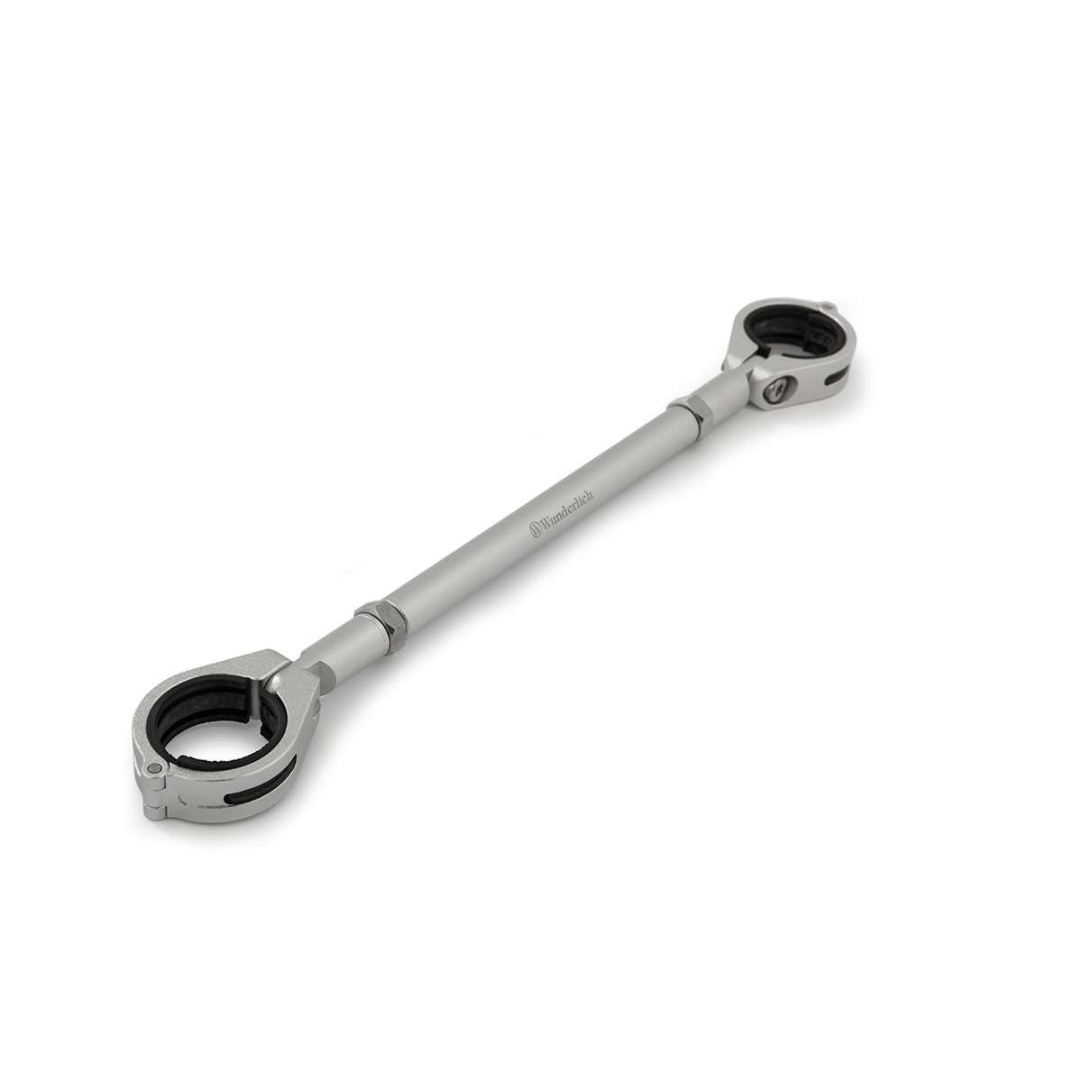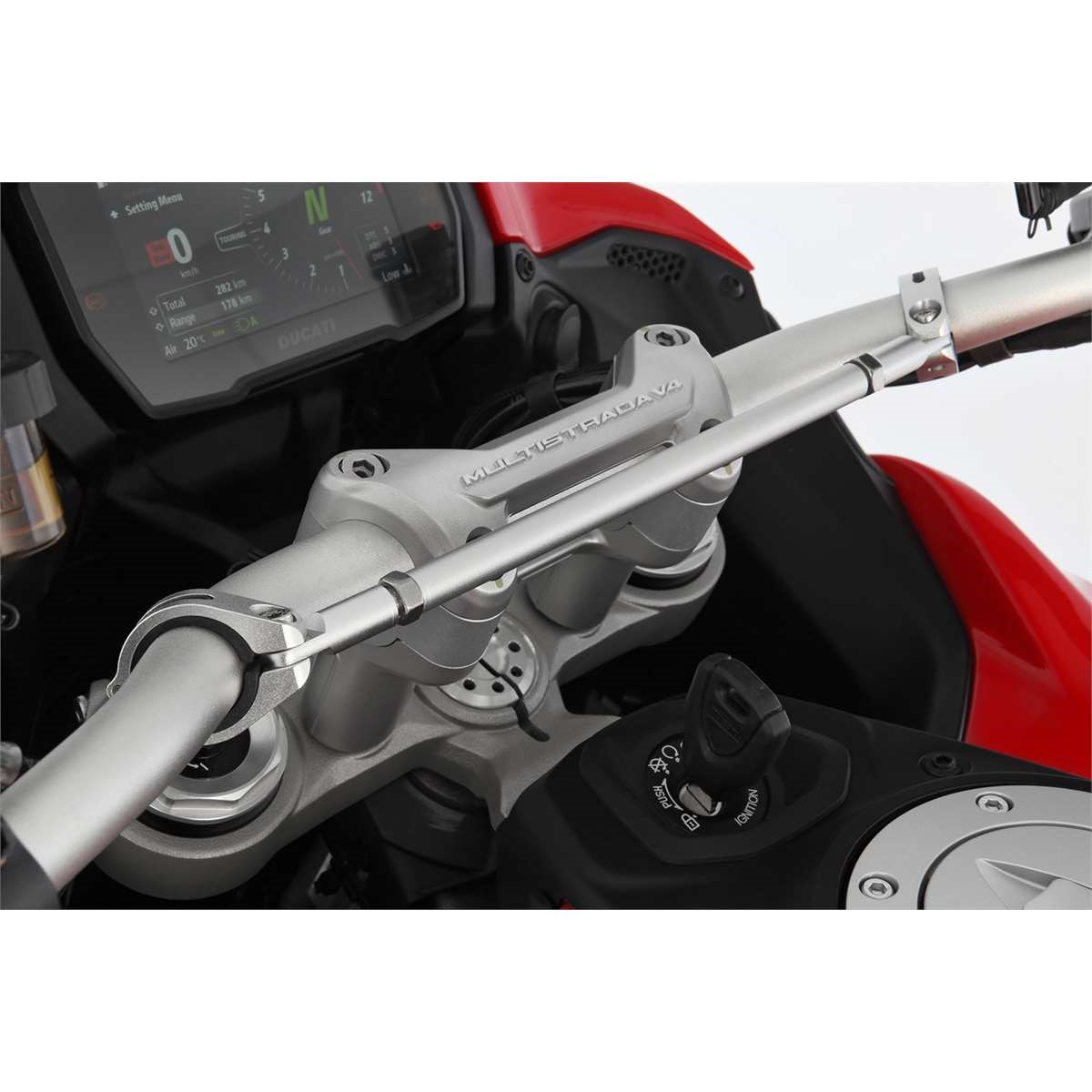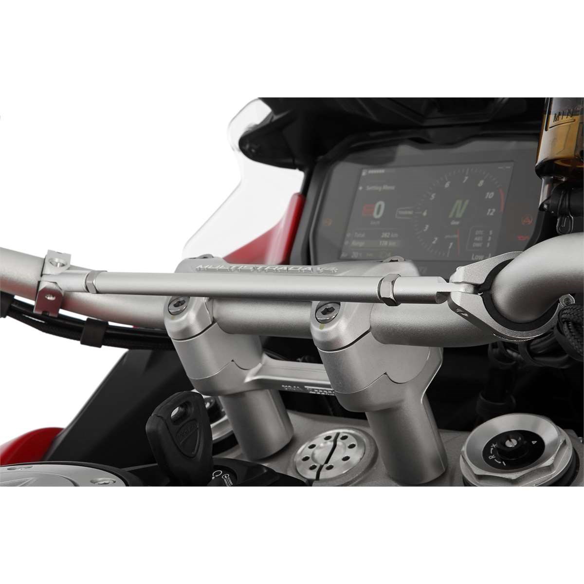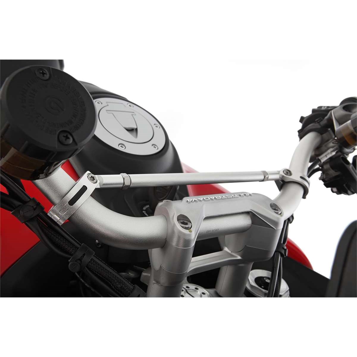 Die hochwertige silberfarbene Lenkermittelstrebe aus Aluminium hat einen Durchmesser von 12 Millimetern, die Oberfläche ist glasperlengestrahlt. Neben der Betonung des adventuretypischen Erscheinungsbilds, dient sie auch als perfekte Basis zum Anbringen von Zubehör. Die Befestigung der Mittelstrebe am Lenker erfolgt dazu mit elastischen Reduzierhülsen, so dass eine Entkopplung von Strebe und Lenker sichergestellt ist. Damit können insbesondere auch elektronische Geräte vibrationsgedämpft befestigt werden.