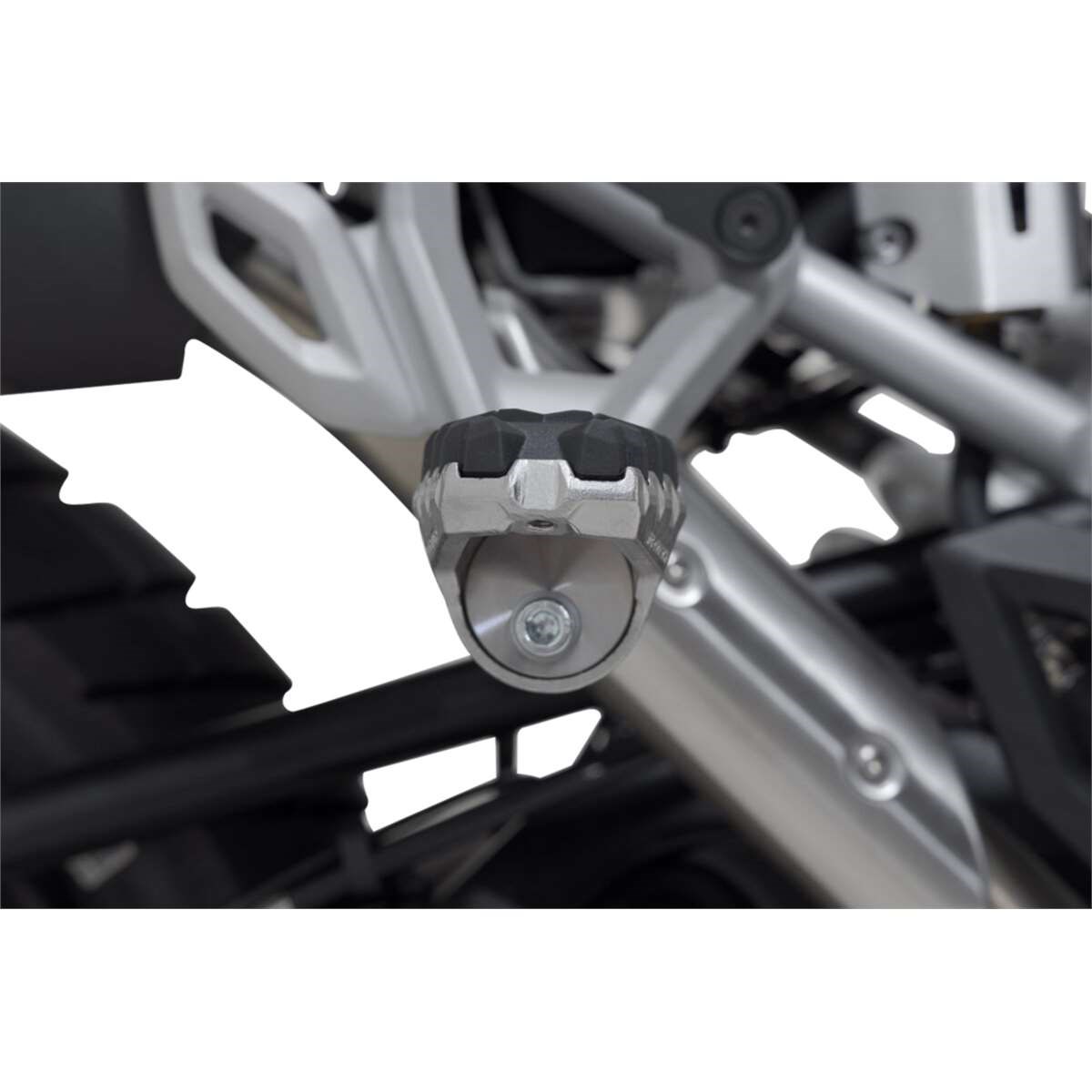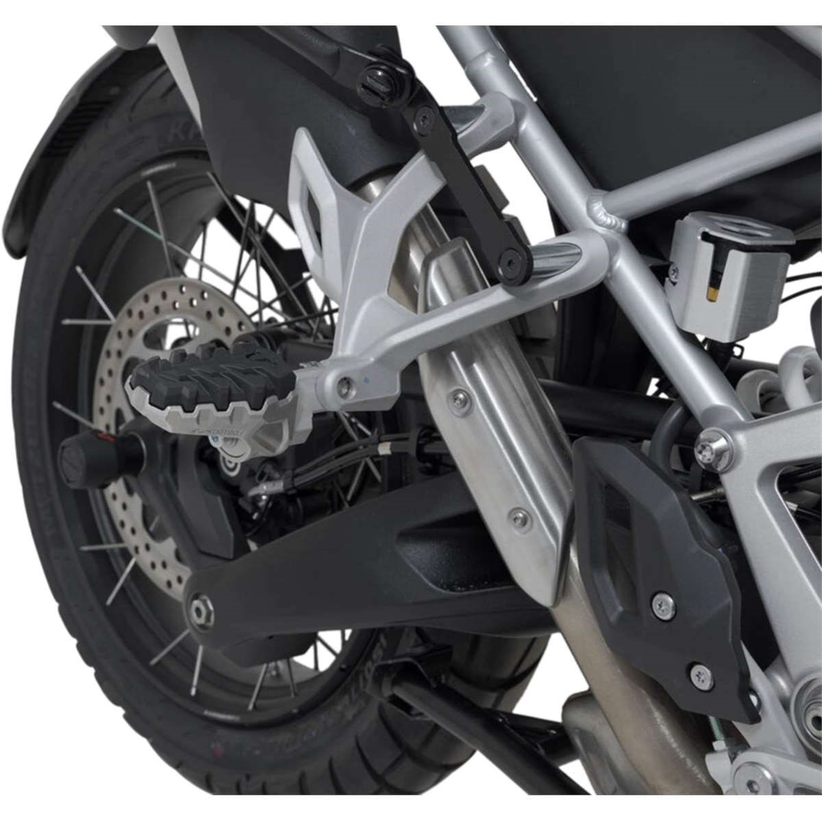 La position n'est pas confortable avec le repose-pied d'origine ? Nous proposons alors la solution idéale : le kit de repose-pieds EVO de SW-MOTECH. Un système ingénieux, composé d?éléments rotatifs à dents fixes qui s'emboîtent, permet 36 possibilités différentes. Le repose-pieds peut être réglé vers l'arrière, l'avant et le bas, et aussi incliné selon les besoins de chaque pilote. Les adaptateurs articulés se montent simplement avec les pièces d'origine sur les supports de repose-pieds. Une notice d'installation explique comment ça marche.
