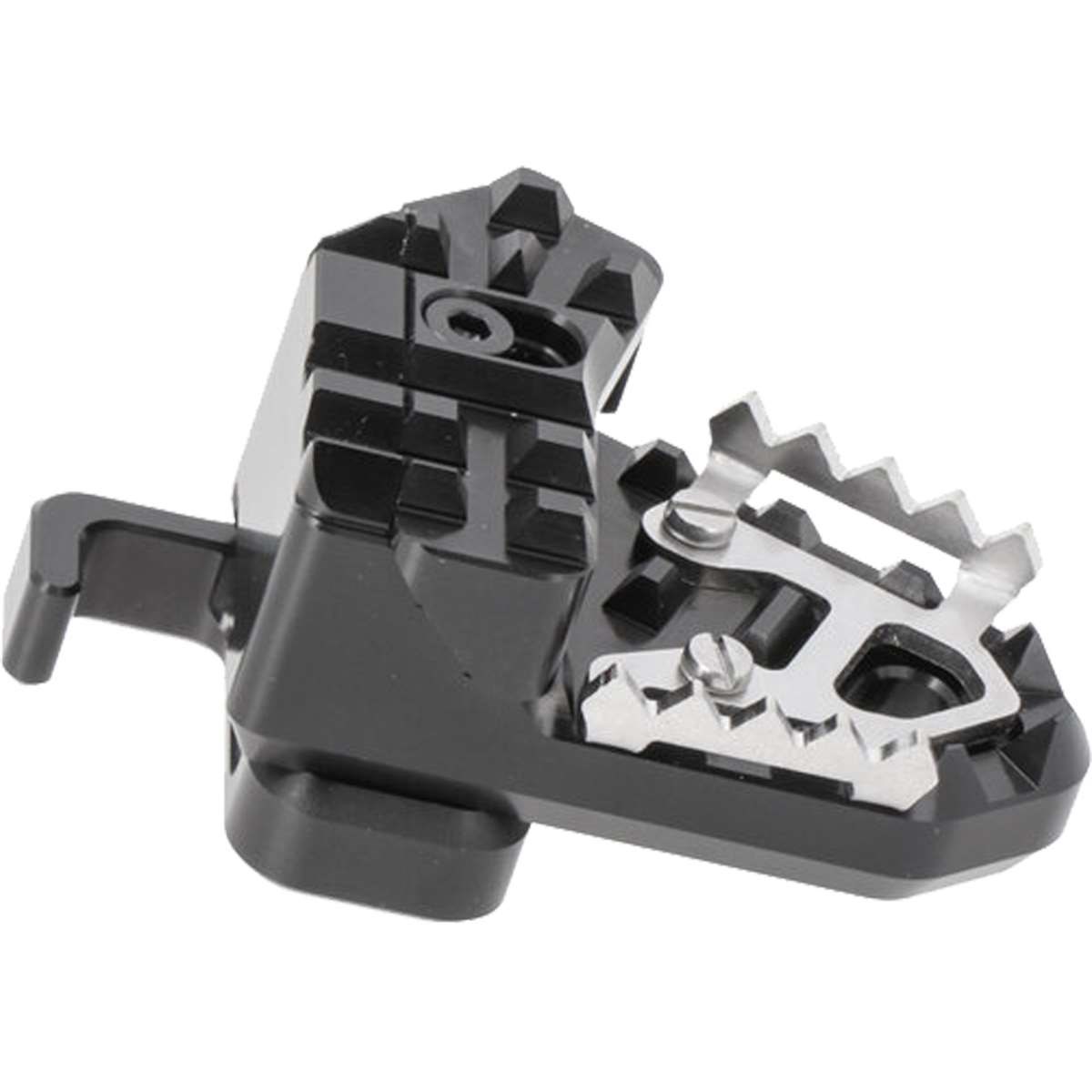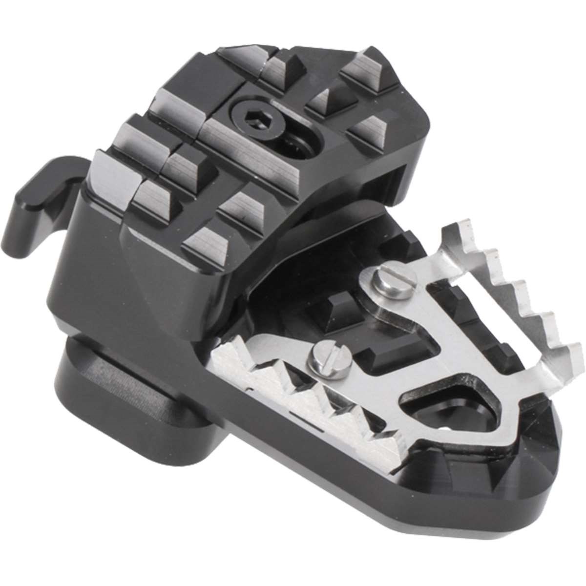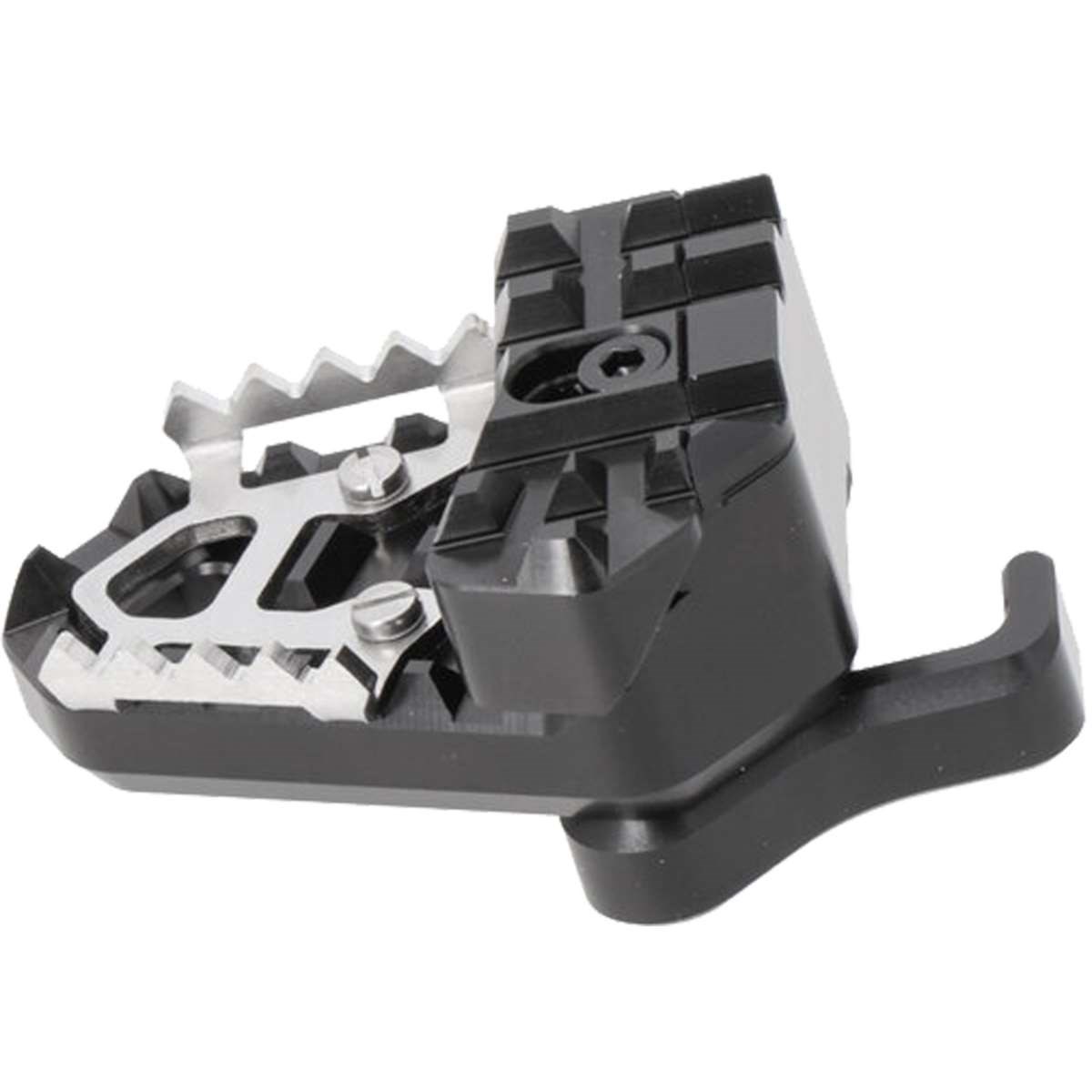 SW-MOTECH fertigt die Erweiterungen aus gefräster und hochfester Aluminiumlegierung mit schwarz eloxierter Oberfläche und mit einem Auftrittsblech in Edelstahl. Für eine optimale Anpassung an die Ergonomie lässt sich die Erhöhung des Bremshebelauftritt in zwei Stufen von 22 oder 27 Millimetern einstellen.