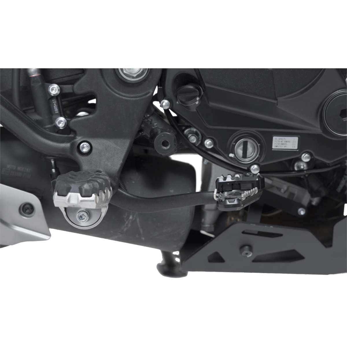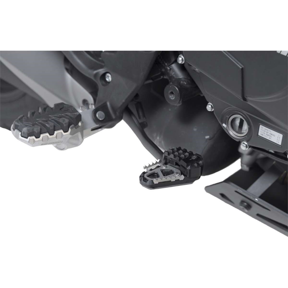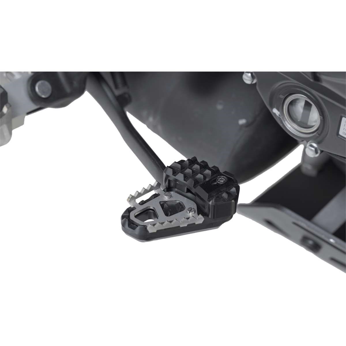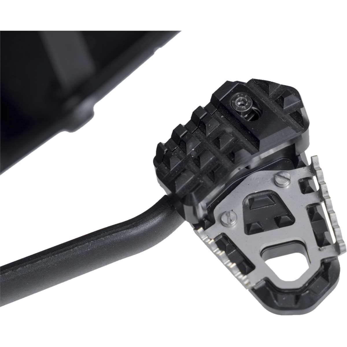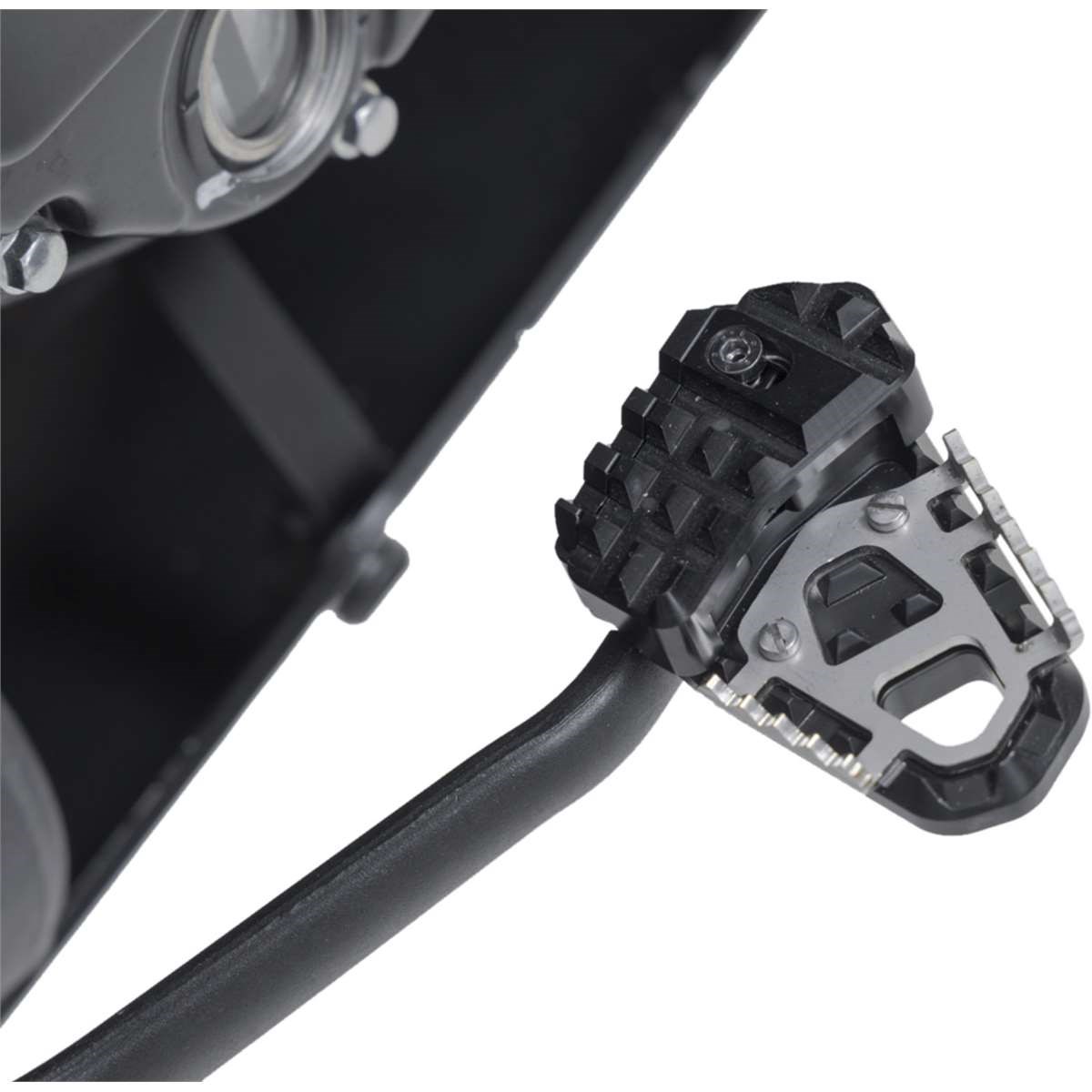 SW-MOTECH fertigt die Erweiterungen aus gefräster und hochfester Aluminiumlegierung mit schwarz eloxierter Oberfläche und mit einem Auftrittsblech in Edelstahl. Für eine optimale Anpassung an die Ergonomie lässt sich die Erhöhung des Bremshebelauftritt in zwei Stufen von 22 oder 27 Millimetern einstellen.