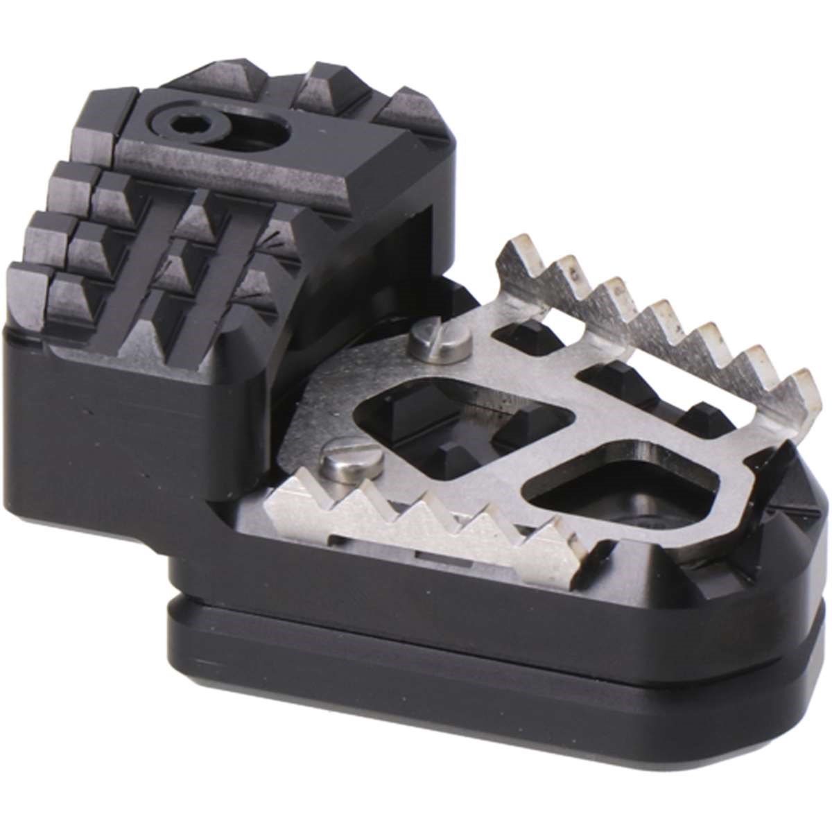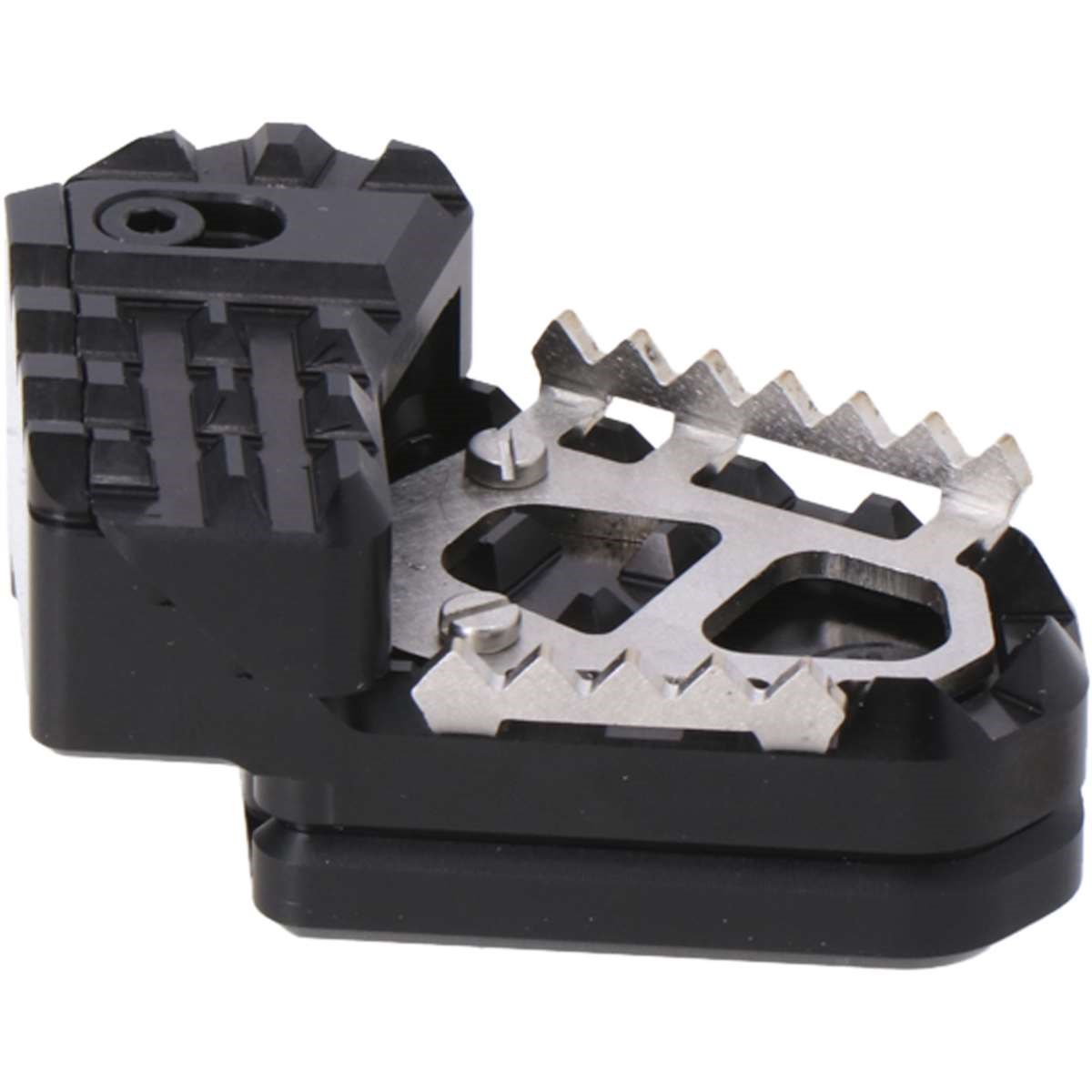 SW-MOTECH fertigt die Erweiterungen aus gefräster und hochfester Aluminiumlegierung mit schwarz eloxierter Oberfläche und mit einem Auftrittsblech in Edelstahl. Für eine optimale Anpassung an die Ergonomie lässt sich die Erhöhung des Bremshebelauftritt in zwei Stufen von 22 oder 27 Millimetern einstellen.