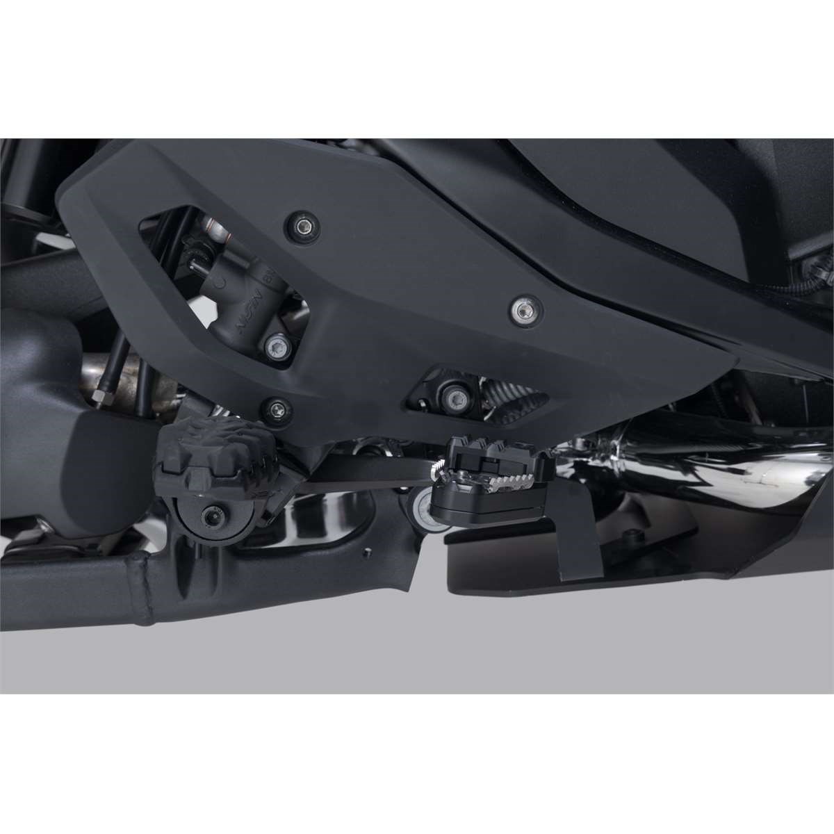 SW-MOTECH fertigt die Erweiterungen aus gefräster und hochfester Aluminiumlegierung mit schwarz eloxierter Oberfläche und mit einem Auftrittsblech in Edelstahl. Für eine optimale Anpassung an die Ergonomie lässt sich die Erhöhung des Bremshebelauftritt in zwei Stufen von 22 oder 27 Millimetern einstellen.