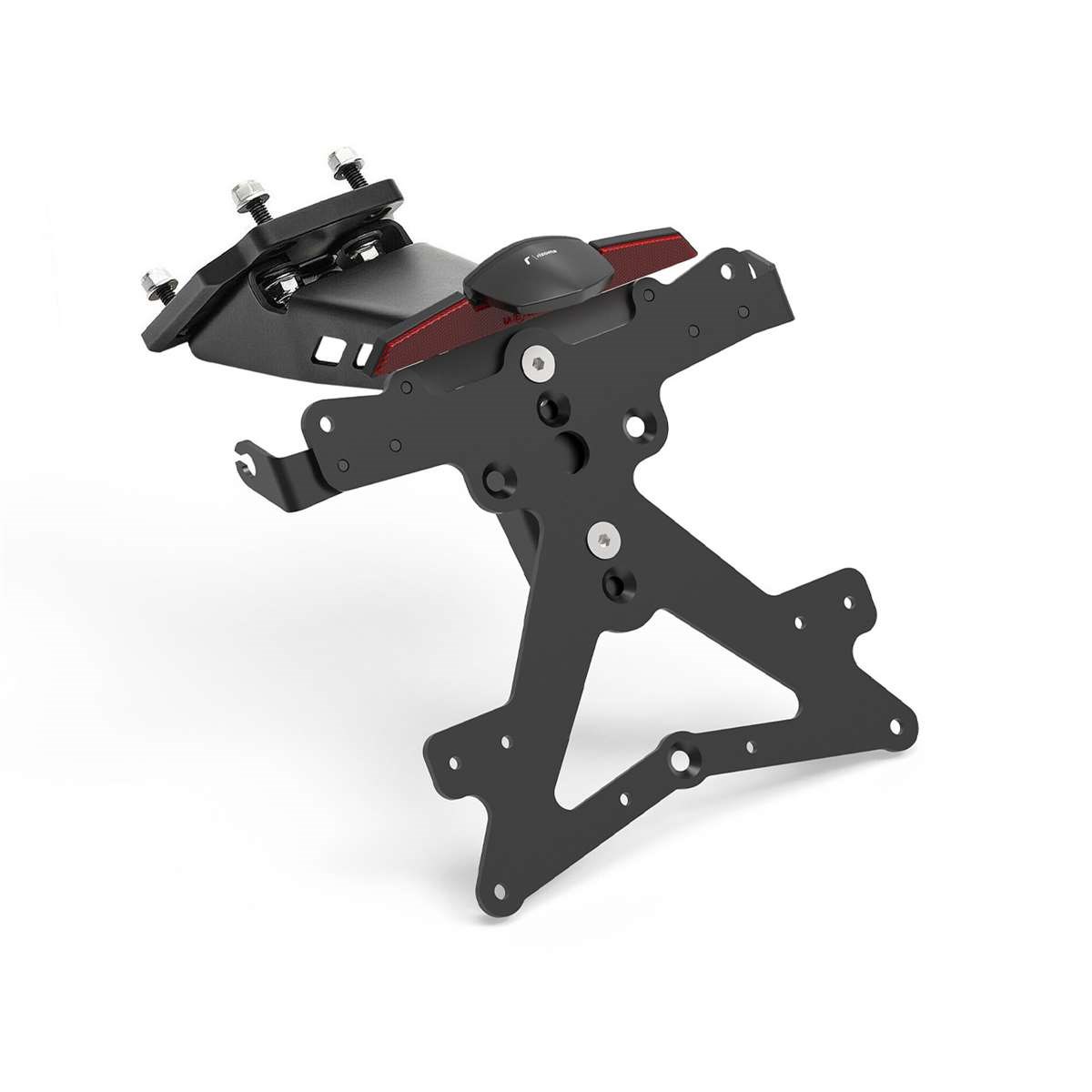 Der aus Aluminium gefertigte Kennzeichenträger Fox ist speziell für das jeweilige Motorradmodell konzipiert. Dadurch passt er sich nicht nur perfekt an die Liniengebung des Motorrads an, sondern punktet zudem durch eine einfache und schnelle Montage. Jedes Kit enthält alle benötigten Montageteile, wobei keine Veränderungen an OEM-Teilen vorgenommen werden müssen. Maximale Funktionalität auf kleinstem Raum und Einhaltung der Zulassungsstandards. Die Fox-Kits enthalten eine SMD-LED-Kennzeichenbeleuchtung, einen Reflektor und Adapter für Rizoma-Blinker, sind verstellbar und mit einem Feststeller zur Fixierung der korrekten Neigung ausgestattet.