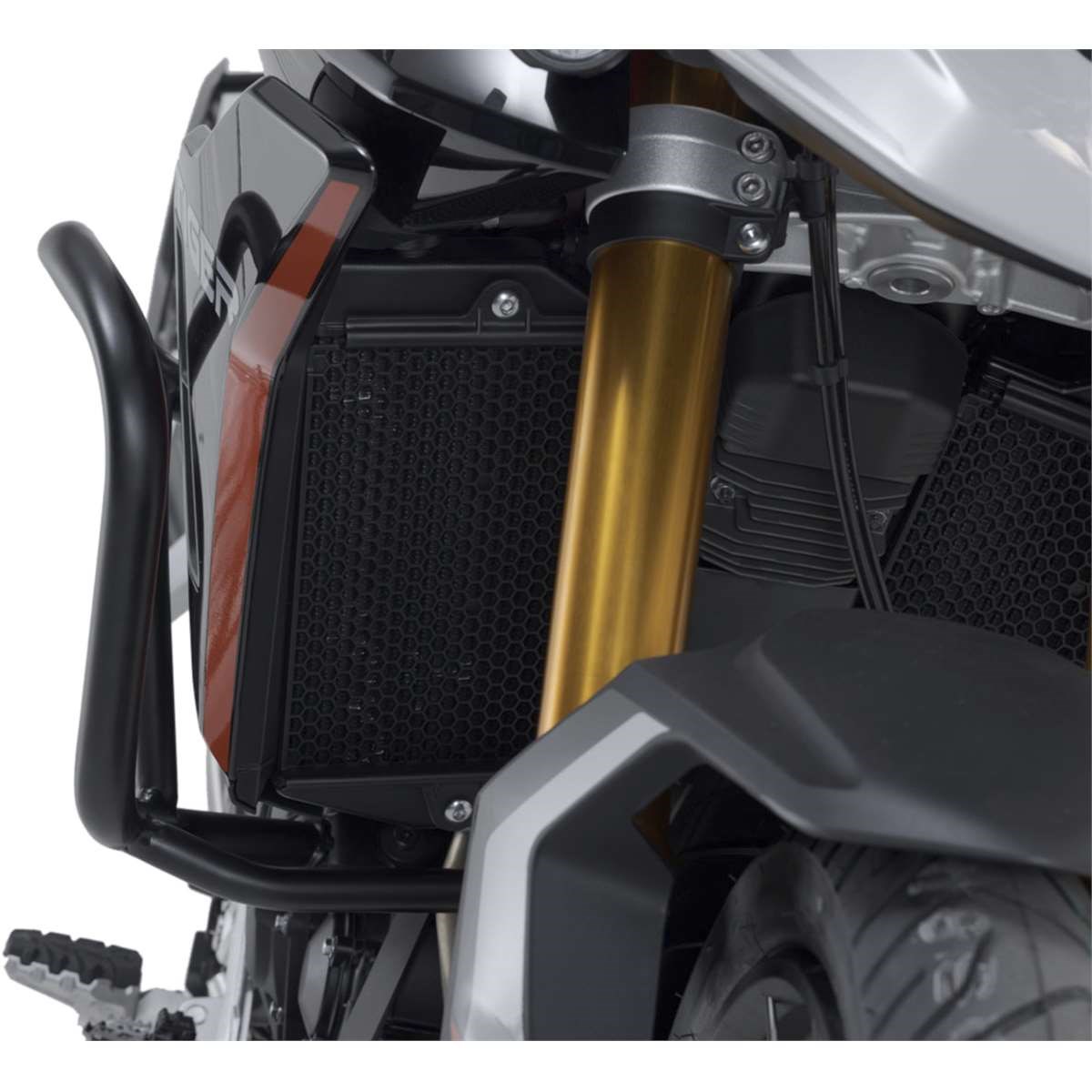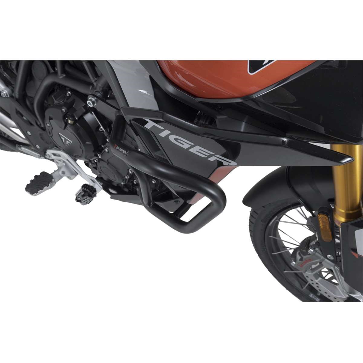 Passend zu den Triumph Tiger 900-Modellen werden die Sturzbügel aus Stahlrohr mit 27 mm Durchmesser mit witterungs- und korrosionsbeständiger Pulverbeschichtung in Schwarz angeboten. Die Oberflächenveredelung erfolgt in einer hochmodernen Anlage im SW-MOTECH Werk im tschechischen Brünn.