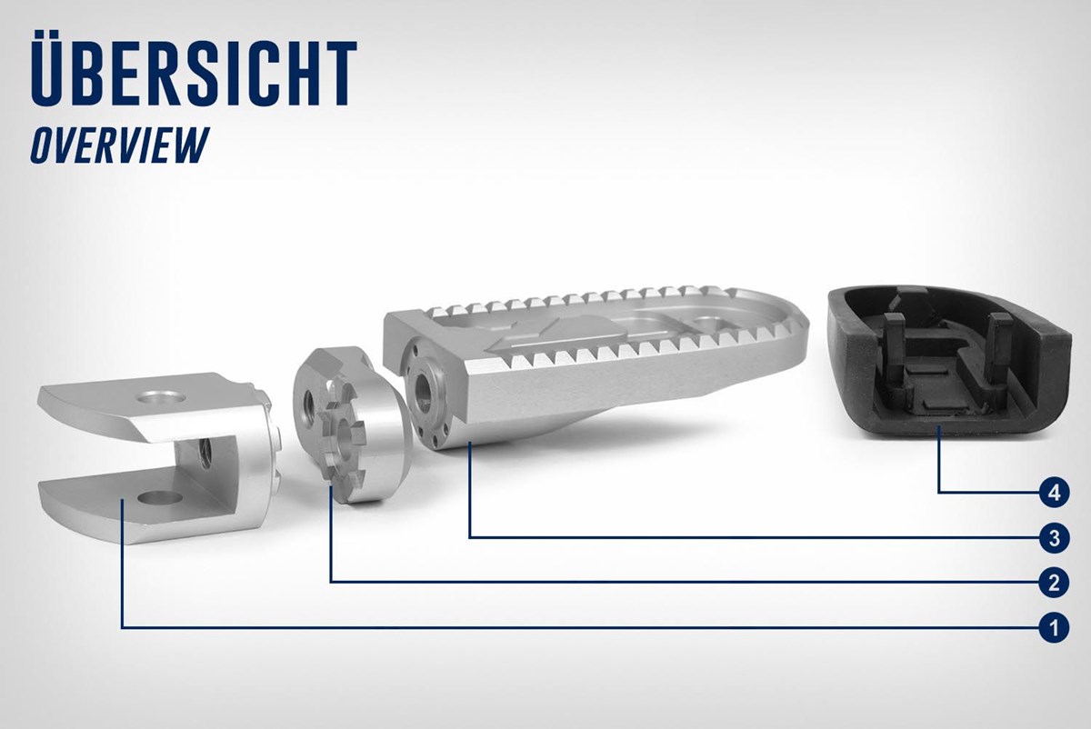 Die Basis des Systems ist das für das jeweilige Fahrzeugmodell passende, silberfarbene oder schwarze Variogelenk, welches anstelle der Fußraste an der Fußrasten-Halterung montiert wird.