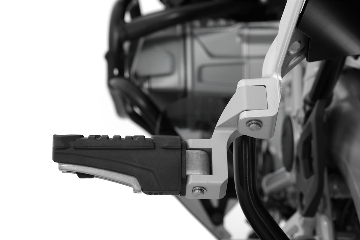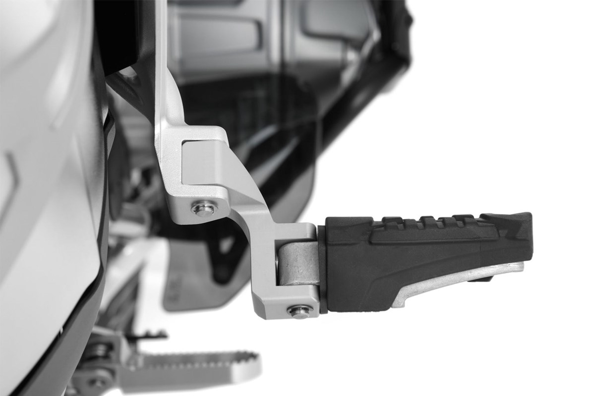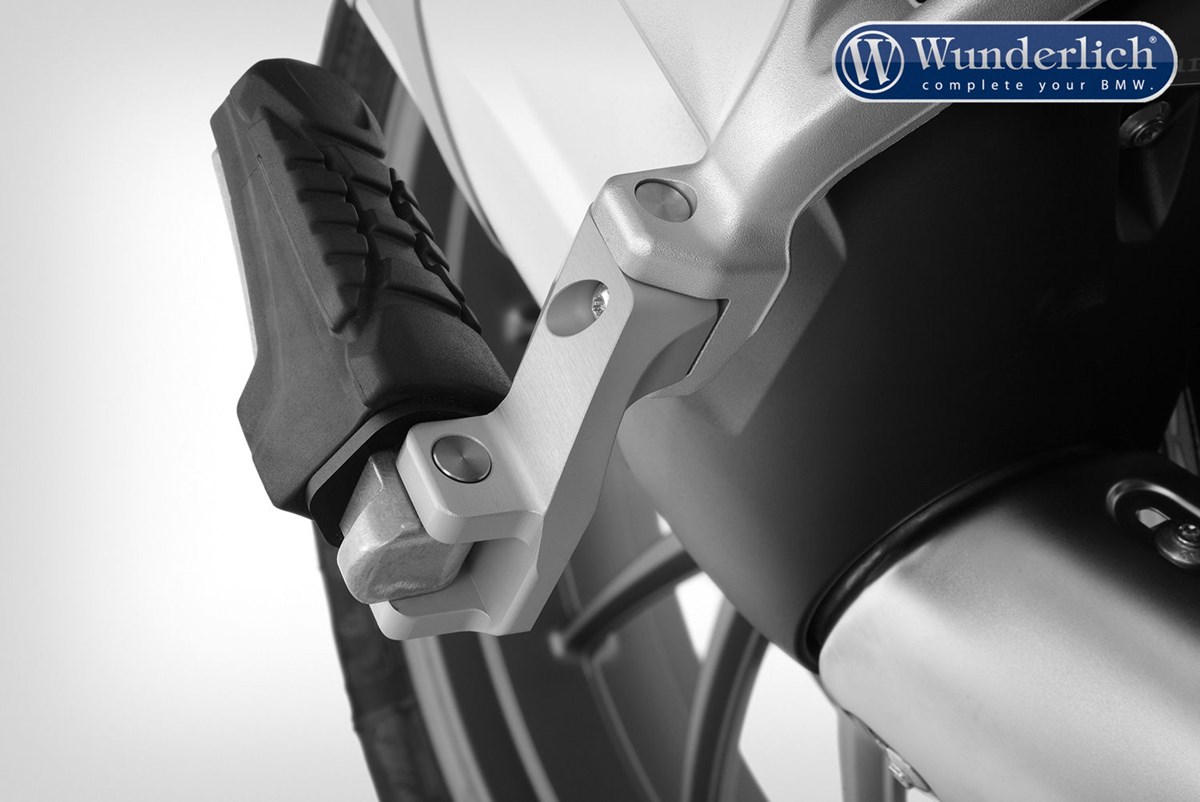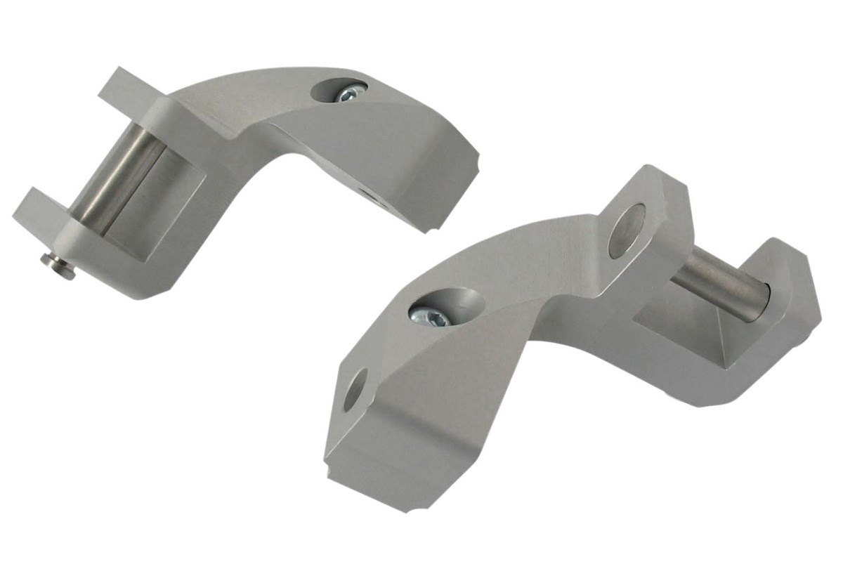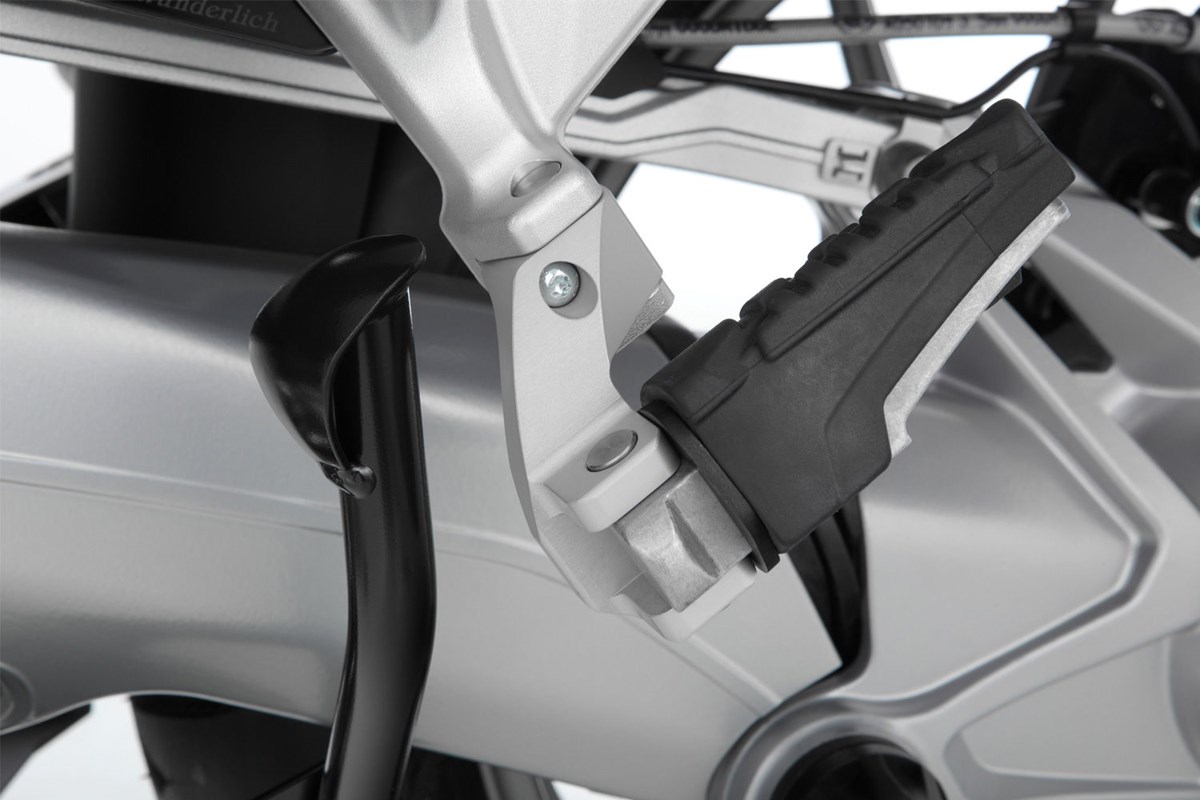 Um die optimale Fußposition zu erreichen, wurde diese Rastenverlegung aufwändig aus dem Vollen gefräst. Zum Lieferumfang gehören alle notwendigen Befestigungsteile. Am Originalhalter muss nichts geändert werden, keine Funktion wird beeinträchtigt und auch die BMW-Systemkoffer passen weiter ohne Einschränkung.