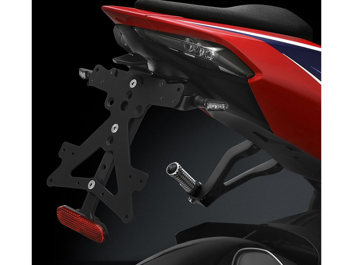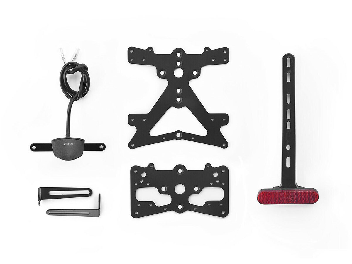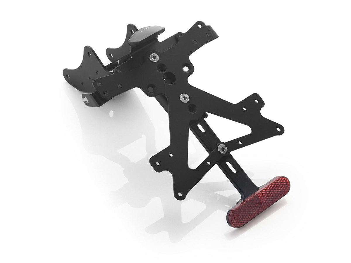 Der aus Aluminium gefertigte Kennzeichenträger Fox ist speziell für das jeweilige Motorradmodell konzipiert. Dadurch passt er sich nicht nur perfekt an die Liniengebung des Motorrads an, sondern punktet zudem durch eine einfache und schnelle Montage. Jedes Kit enthält alle benötigten Montageteile, wobei keine Veränderungen an OEM-Teilen vorgenommen werden müssen. Maximale Funktionalität auf kleinstem Raum und Einhaltung der Zulassungsstandards. Die Fox-Kits enthalten eine SMD-LED-Kennzeichenbeleuchtung, einen Reflektor und Adapter für Rizoma-Blinker, sind verstellbar und mit einem Feststeller zur Fixierung der korrekten Neigung ausgestattet.