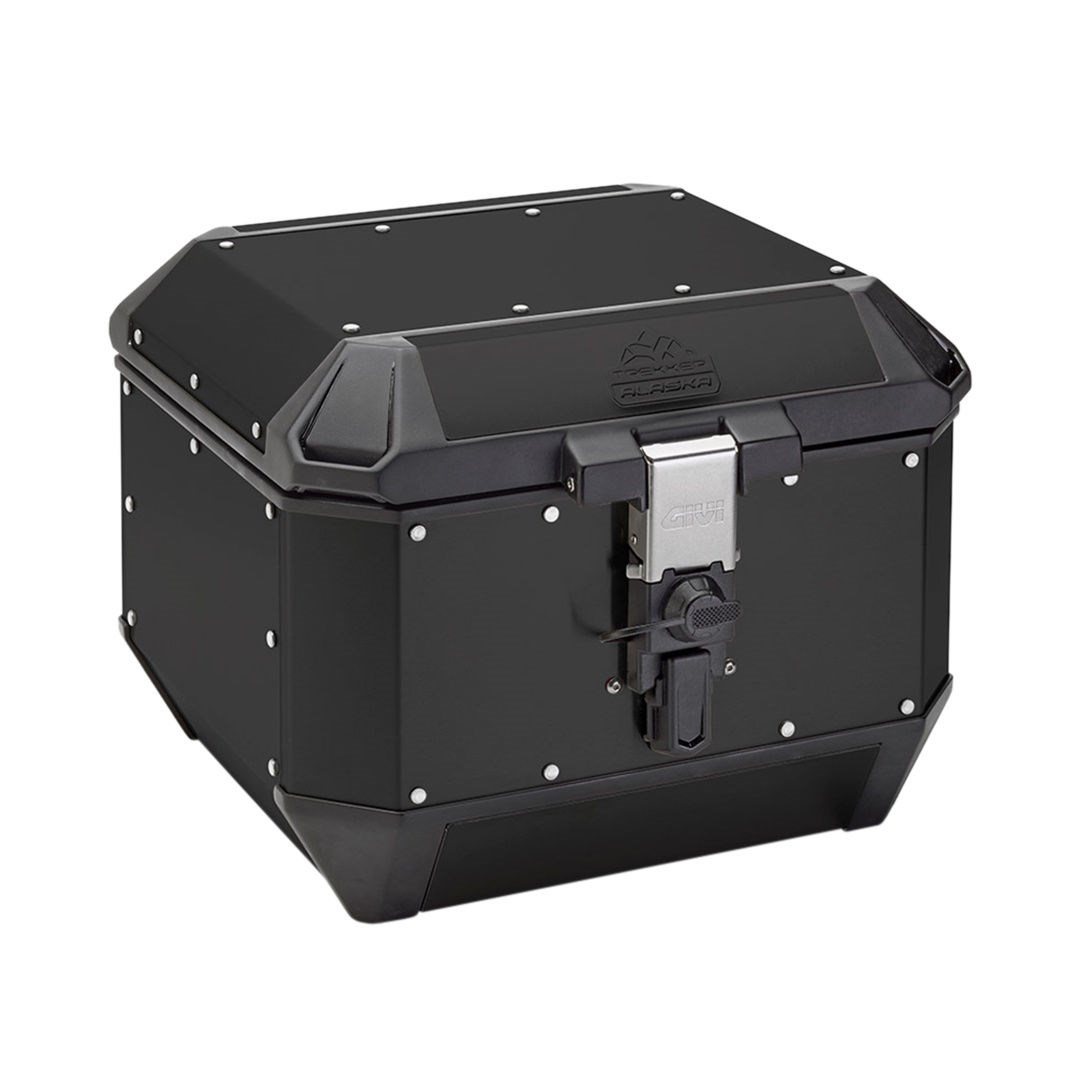 Motorrad-Koffer Trekker Alaska in Aluminium Natur, oder schwarz lackiert, Inhalt 44 L. Ausgerüstet mit dem weltweit am weitesten verbreiteten Befestigungssystem MONOKEY®, das es ermöglicht, nur ein einziges Schloss zu haben, so dass das Öffnen und das Ausklinken aus der Platte mit demselben Schlüssel erfolgt. Kompatibel mit allen Monokey-Platten, ausser denen mit Kontakt für das Bremslicht-Kit.