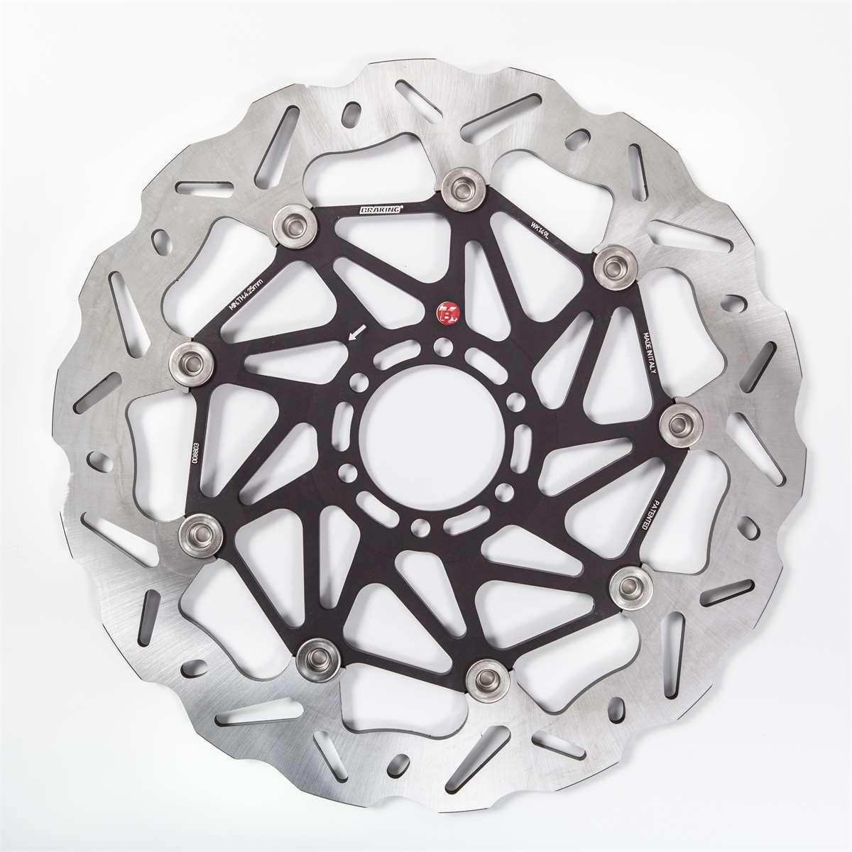 Bremsscheibe vollschwimmend mit gelochtem Stahlaussenring im Wave Design, Innenring aus Aluminium.