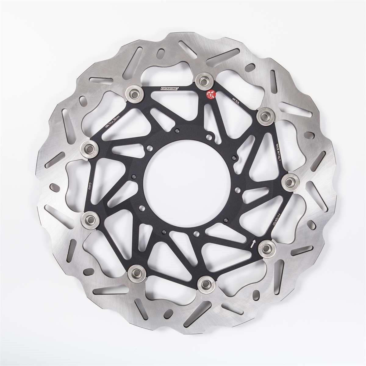 Bremsscheibe vollschwimmend mit gelochtem Stahlaussenring im Wave Design, Innenring aus Aluminium.