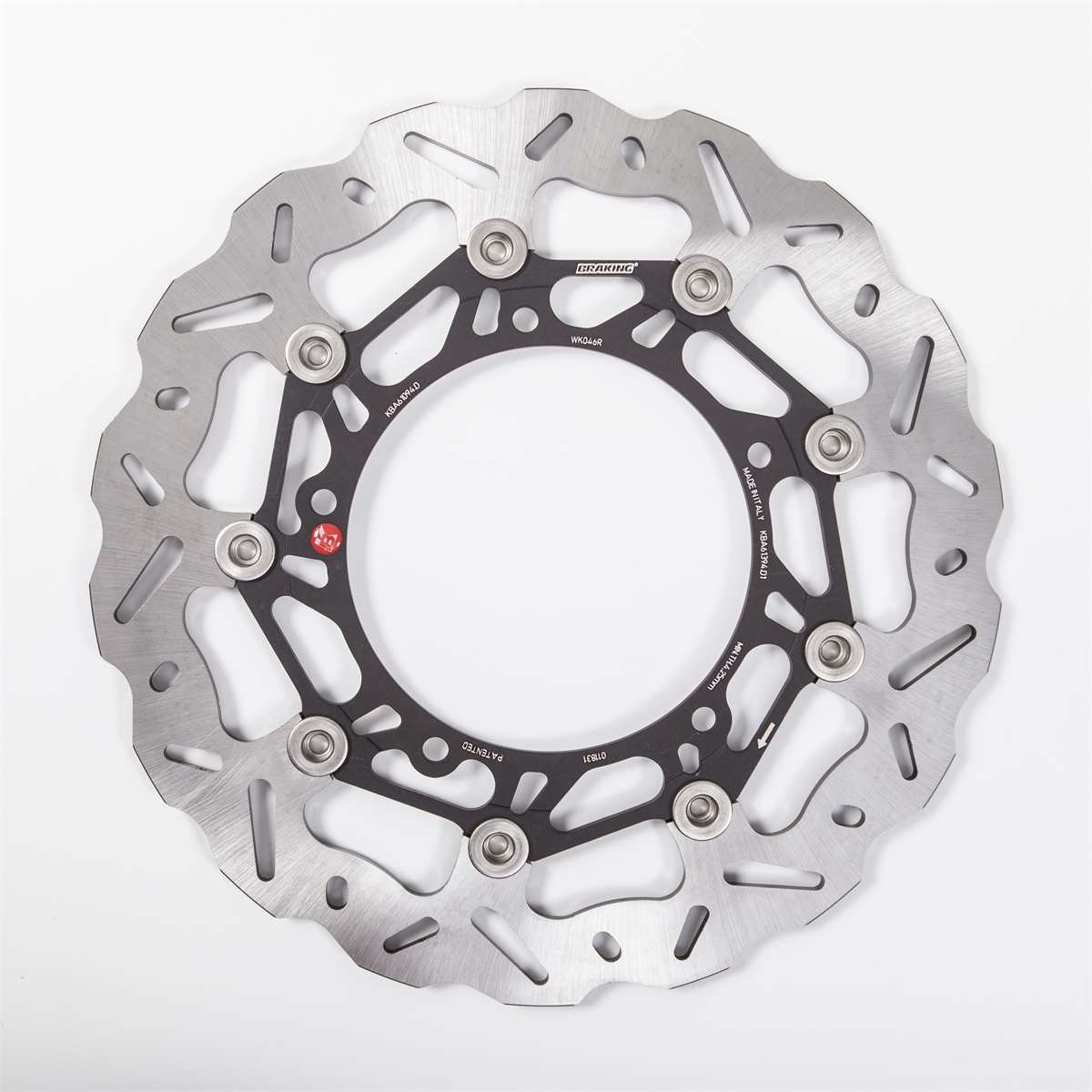 Bremsscheibe vollschwimmend mit gelochtem Stahlaussenring im Wave Design, Innenring aus Aluminium.