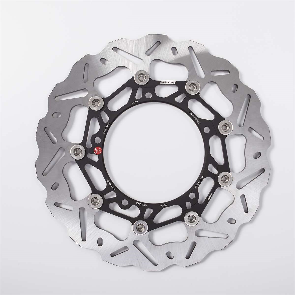 Bremsscheibe vollschwimmend mit gelochtem Stahlaussenring im Wave Design, Innenring aus Aluminium.